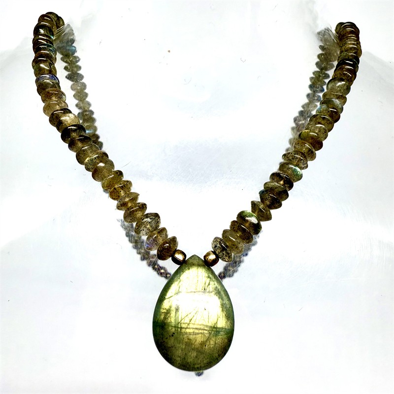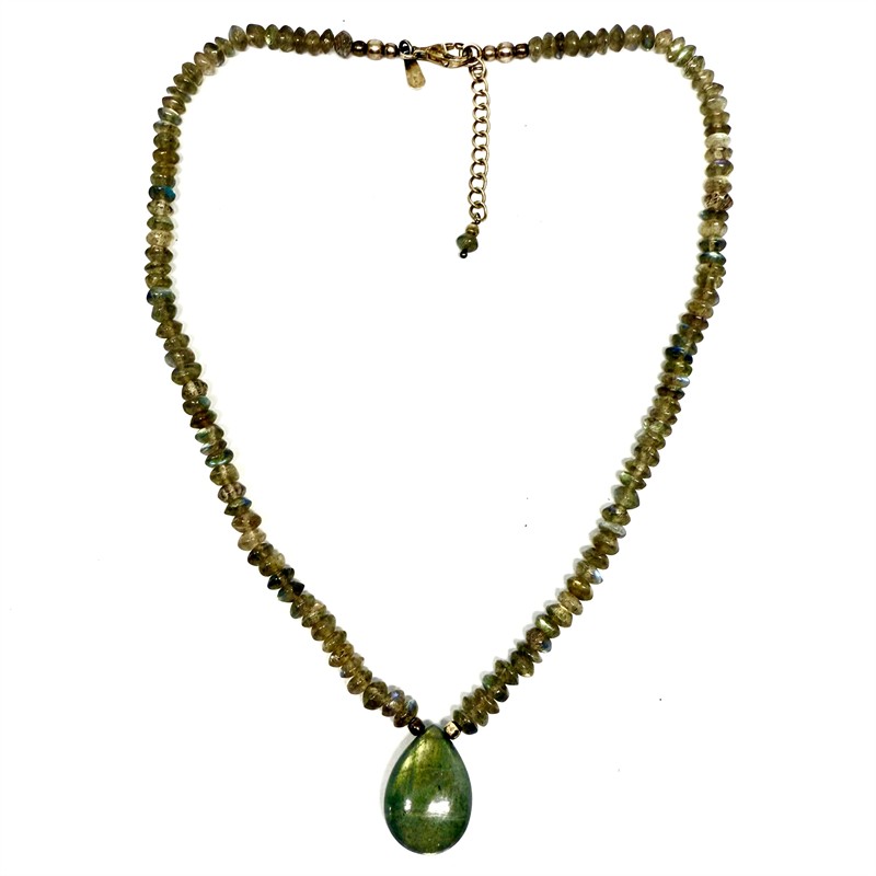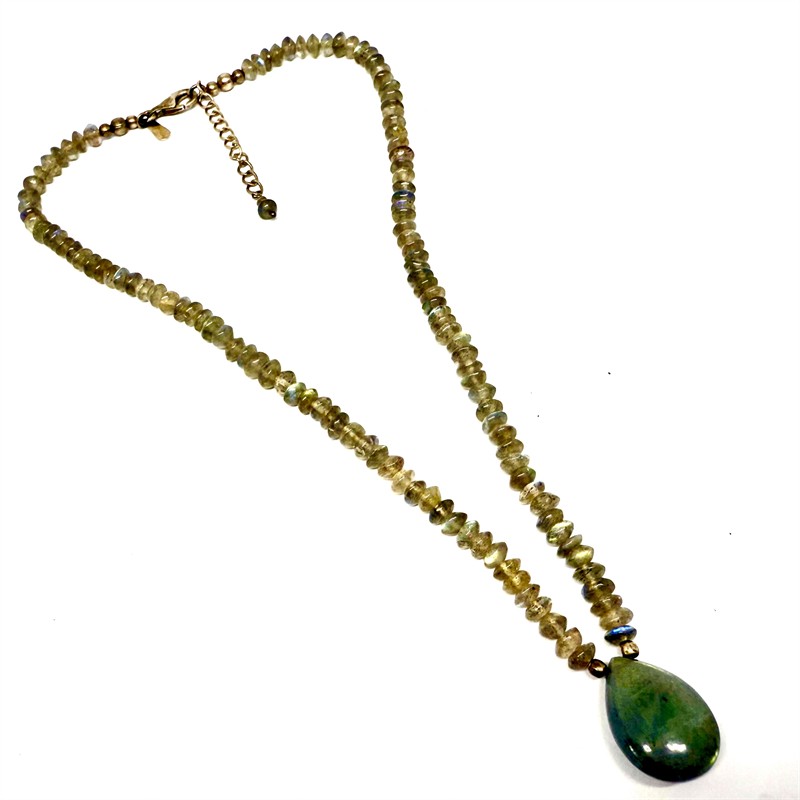 Originální náhrdelník zhotovený z labradoritů s půvabnou barvoměnou, zakončen zapínáním ze sterlingového stříbra (925/1000). Celková váha 22,17 g. Délka 41cm plus prodlužovací řetízek 5 cm. Perfektní stav.