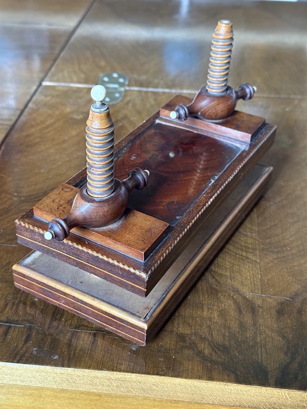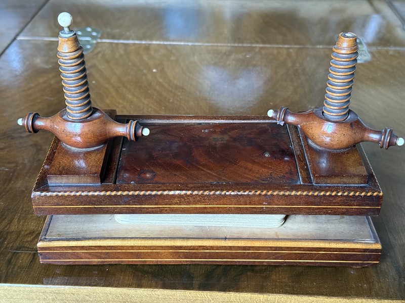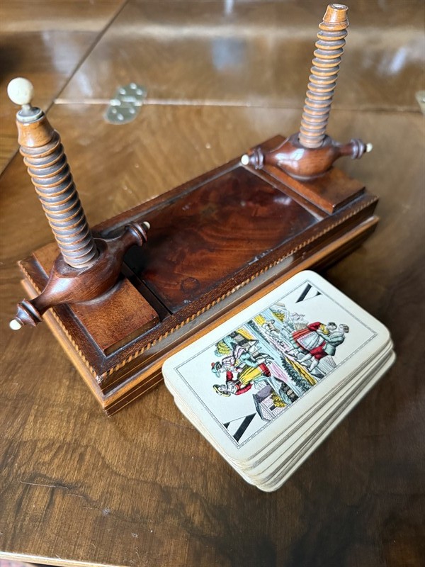 22 x 10 x 15 cm, funkční, krásný, polovina 19 stol, Karty jsou tarokové, ručně kolorované, kompletní 54 kusů kolem roku 1890 z Vídně. Reverz karet je turecký půlměsíc. Krásná dekorace