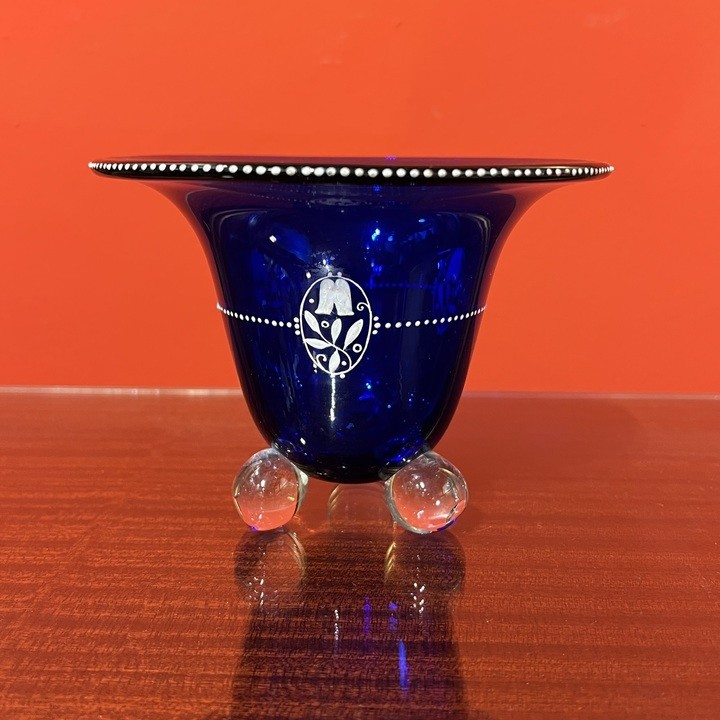 Loetz, Klášterský Mlýn, Čechy, 20. léta 20. století váza na třech skleněných nožkách, výška: 10,5 cm, horní průměr: 14 cm