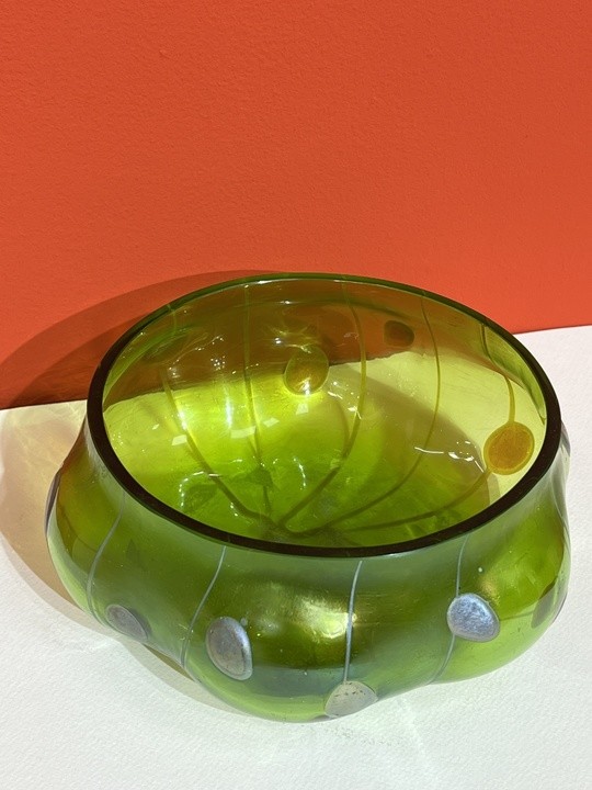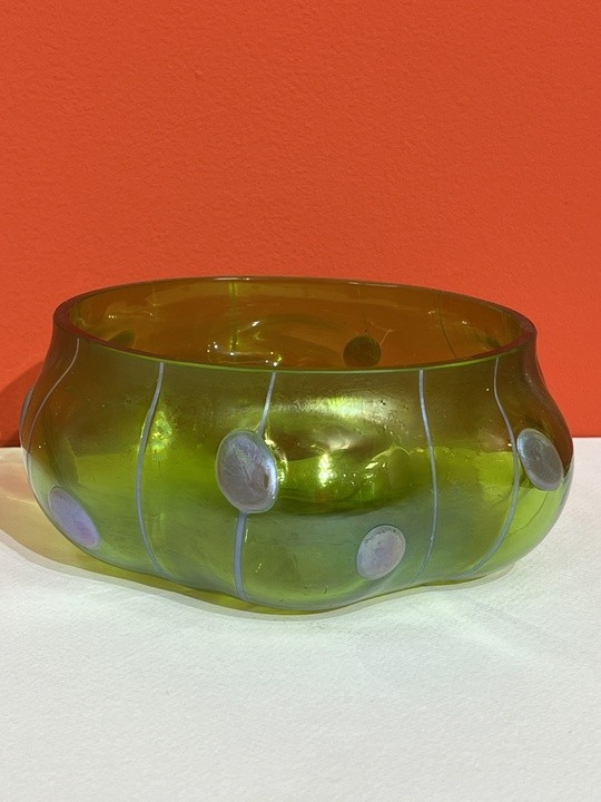 Secesní mísa Loetz, Čechy, kolem roku 1905 sklo irisované, dekor ”pruhy a skvrny” Streifen und flecken, rozměry: 9 x 18 cm