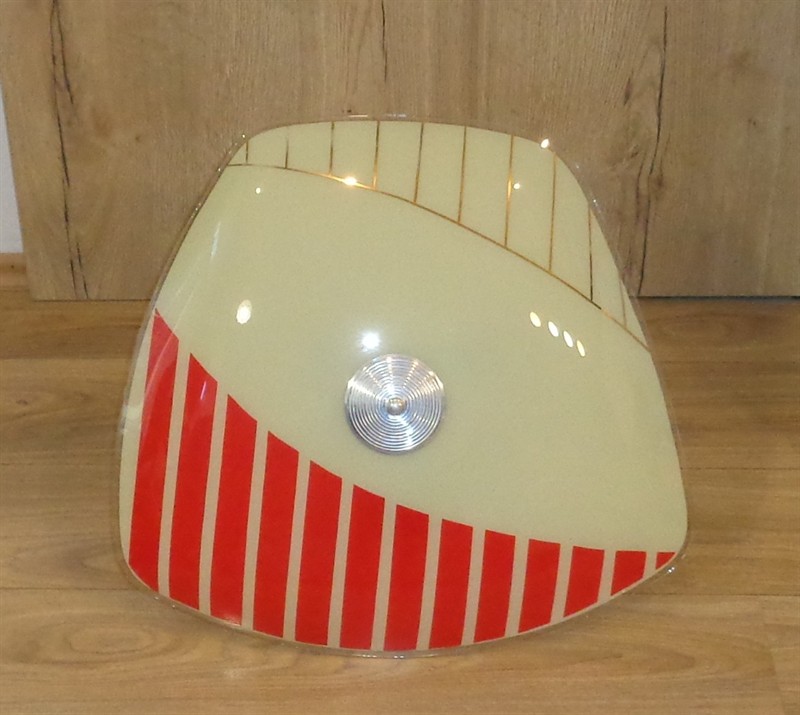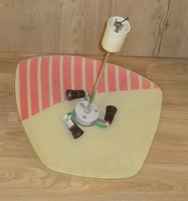 Lustr v bruselském stylu,zajímavé asymetrické sklo,původní elektrifikace,materiál sklo,hliník a plast,výška cca 50 cm,rozměr talíře 53,5x50 cm.