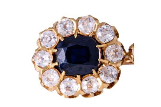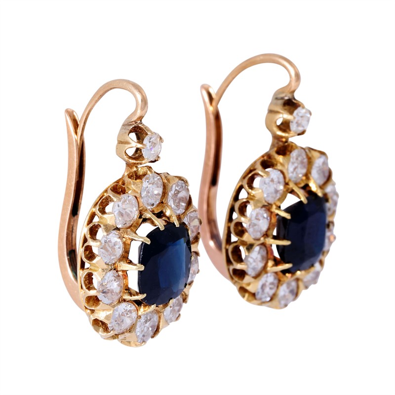 Luxusní starožitné zlaté náušnice jsou osazeny přírodními safíry australského typu velmi dobré kvality o celkové hmotnosti 3,6 ct a přírodními diamanty starého briliantového brusu o celkové hmotnosti 2,54 Ct Vs2 - Si, nádherné, reprezentativní náušnice pochází z první poloviny 20. století a jsou vyrobeny ze zlata o ryzosti 16 karátů, 700/1000 o celkové hmotnosti 8,40 g rozměry náušnic 2,5 x 1 cm, Atest Puncovního úřadu, Znalecký posudek o pravosti kamenů přiložen