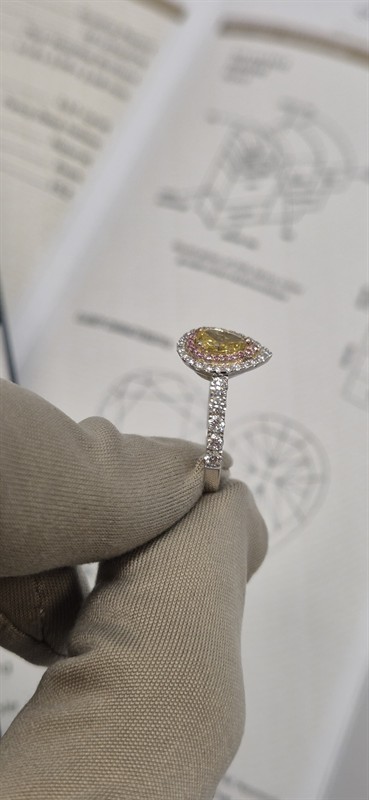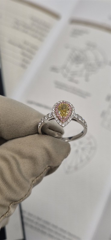 Ponúkam na predaj výnimočný a mimoriadne vzácny šperk s centrálnym prírodným farebným diamantom, doplnený o prírodné ružové diamanty v elegantnom halo dizajne. Ide o exkluzívny klenot vhodný pre náročného klienta alebo ako investičný šperk. Hlavný diamant má váhu 0,51 ct, farbu Fancy Deep Yellow, tvar hruška (pear), čistotu VS2 a je prírodného pôvodu (natural). Je certifikovaný renomovanou inštitúciou Gemological Institute of America (GIA) – č. 5516566579. Prsteň je osadený v luxusnom halo dizajne, ktorý zvýrazňuje centrálny kameň, pričom lemovanie tvorí kombinácia prírodných ružových diamantov (natural pink diamonds) a bielych diamantov pre maximálny lesk. Diamanty sa nachádzajú aj na ramenách prsteňa a celý šperk je spracovaný s dôrazom na detail a vysokú kvalitu. Fancy deep yellow diamanty tejto kvality patria medzi najvzácnejšie farebné diamanty. Podľa Fancy Color Research Foundation (FCRF) ide o výnimočne raritnú kategóriu – len približne 1 z 220 000 diamantov.