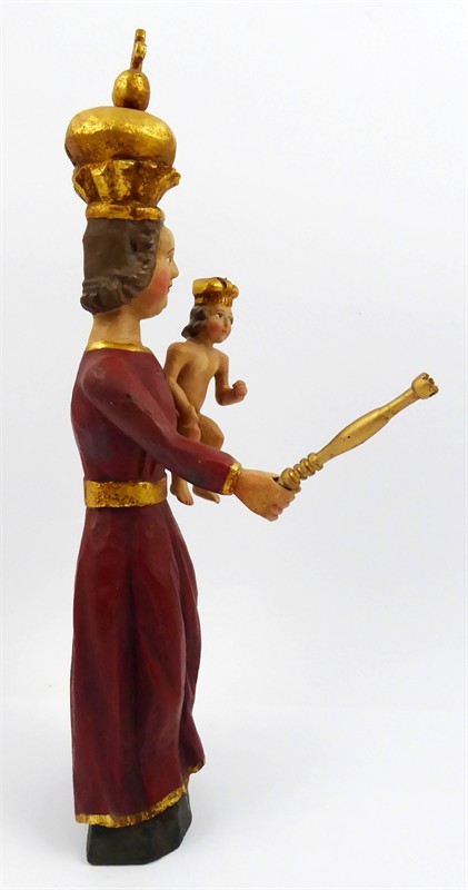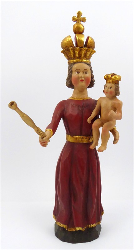 Dřevořezba, polychromie. Přiloženo osvědčení Národního památkového ústavu České republiky. Stylizovaná dřevořezba Madony s Ježíškem v náručí. Stylem oblékání je dřevořezba blízká typu Panny Marie Lomecké. Čelní postava s rukama široko předpaženýma, kdy v pravé ruce drží Madona zlacené žezlo a na levém předloktí má usazeného malého nahého Ježíška. Madona je oděna ve dlouhých splývavých šatech v pasu přepásaných zlatým páskem. Oba jsou korunováni. Záda plně opracována. Na jednoduchém nízkém podstavci. Střední Evropa, 20. století. Výška 41 cm.