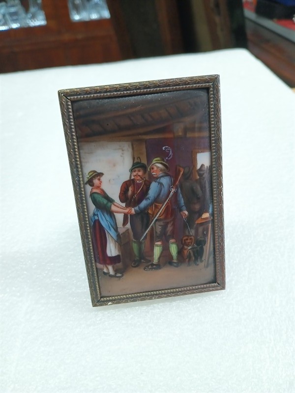 Loučení - obrázek malovaný na porcelánu , signováno nečitelně .19.st. Námět dle Franze v. Defreggera. Porcelánová destička vsazena do mosazného rámu. Rozměry 9,2 x 6,2 cm .