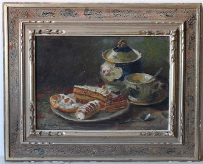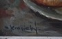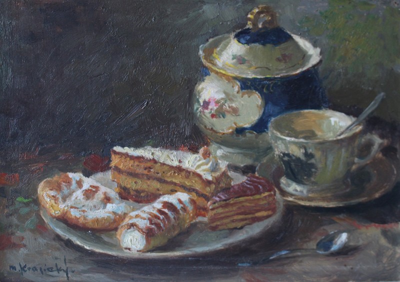 Marcel Krasický (1898 - 1968) - Snídaňové zátiší  Signováno viz foto. Malíř a grafik v Kvasicích. Studoval na speciální malířské škole Karla Truppeho v Brně, soukromě u F. Hlavici v Brně. Obraz je v krásném, ručně vyřezávaném rámu. Olej na kartonu. Rozměry: 26 x 36 cm malba, 41 x 52 cm rám.