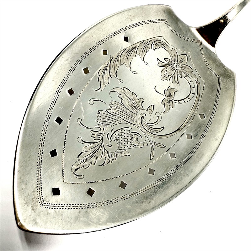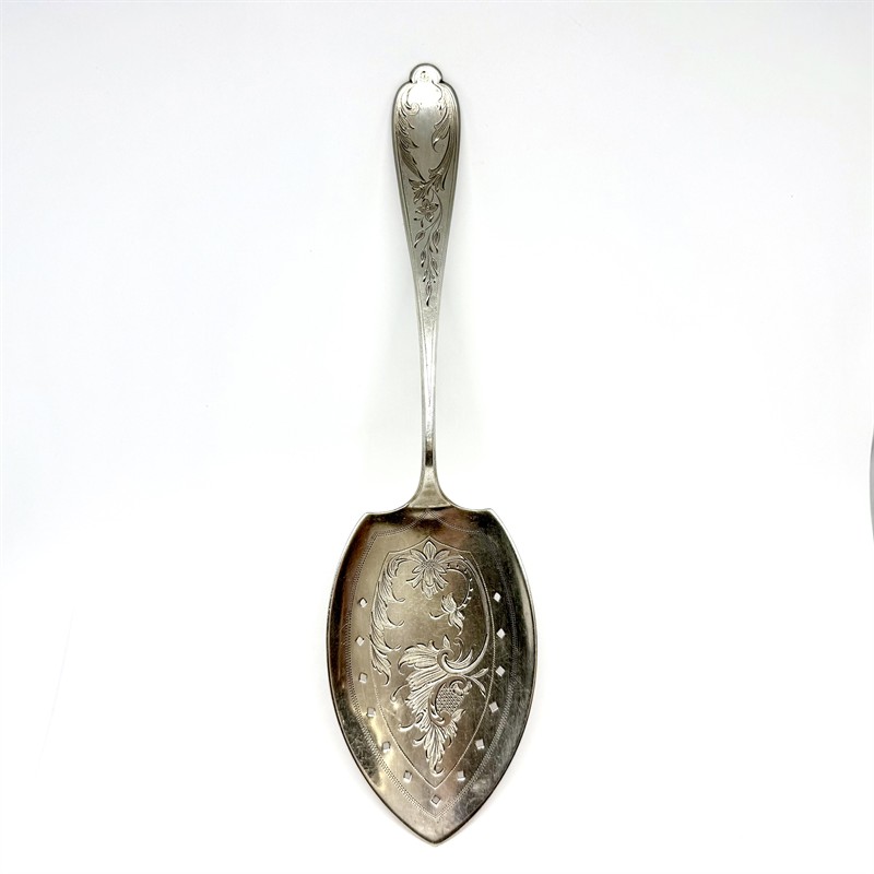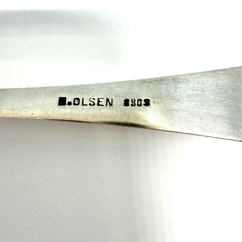 Elegantní, velká dortová lžíce z masivního stříbra. Artefekt byl zhotoven ze stříbra ryzosti 800/1000 počátkem 20. století. Detailně zdobeno ručním rytím s florálním motivem a průřezy čtverců. Váha 83,40 g. Rozměry 27,5 x 7,5 cm. Značeno Olsen, ryzostní a puncovní značkou. Perfektní stav.