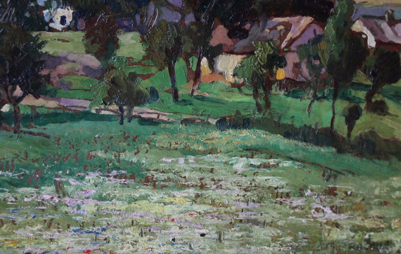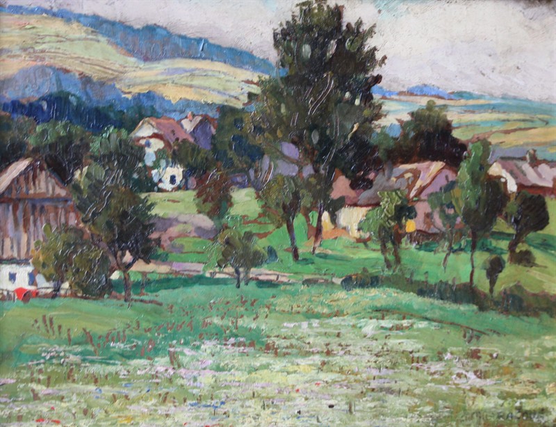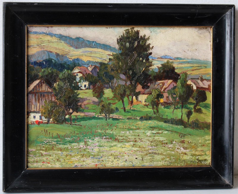 Míla Pačová (1890 1957) - Odpoledne ve vesnici   Signováno viz foto. Základům malby se učila u svého otce arch. G. Pače, poté u F. Emgelmüllera a v Paříži v ateliéru Academie de la grande Chaumiere. V malířské tvorbě se věnovala krajinářství a karikatuře. Působila také jako herečka, byla členkou Vinohradského divadla. Na druhé straně obrazu štítek Národní galerie, viz foto. Olej na kartonu. Rozměry malba: 26 x 34 cm.