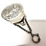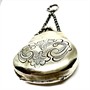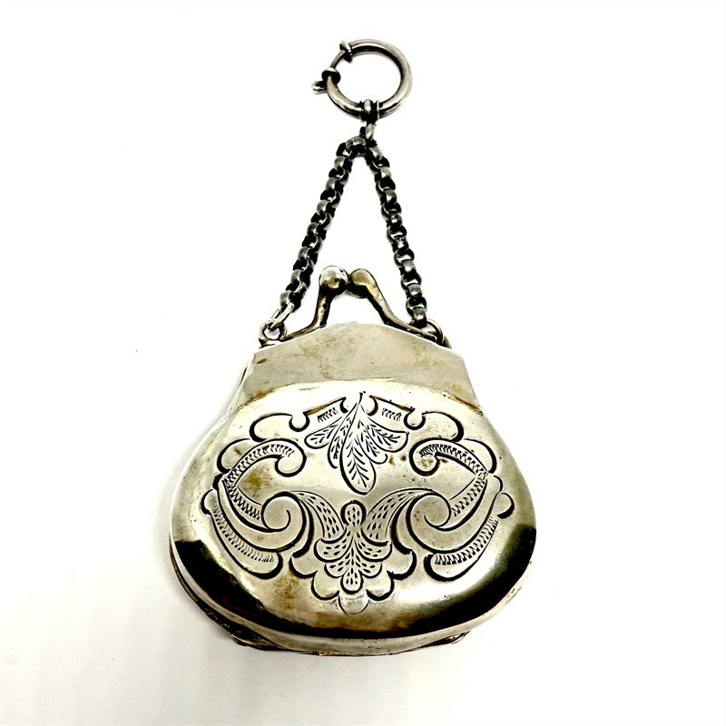 Nevšední, velmi stará, miniatura masivní stříbrné kabelky. Artefakt je možné nosit jako výrazný závěs, či užívat na drobné mince. Zhotoveno ze stříbra ryzosti 835/1000, řetízek a pérový kroužek sterlingové stříbro. Celková váha 66,15 g. Zdobeno hlubokým ručním rytím. Rozměry kabelky bez závěsu 6,5 x 6 cm. Plně funkční.