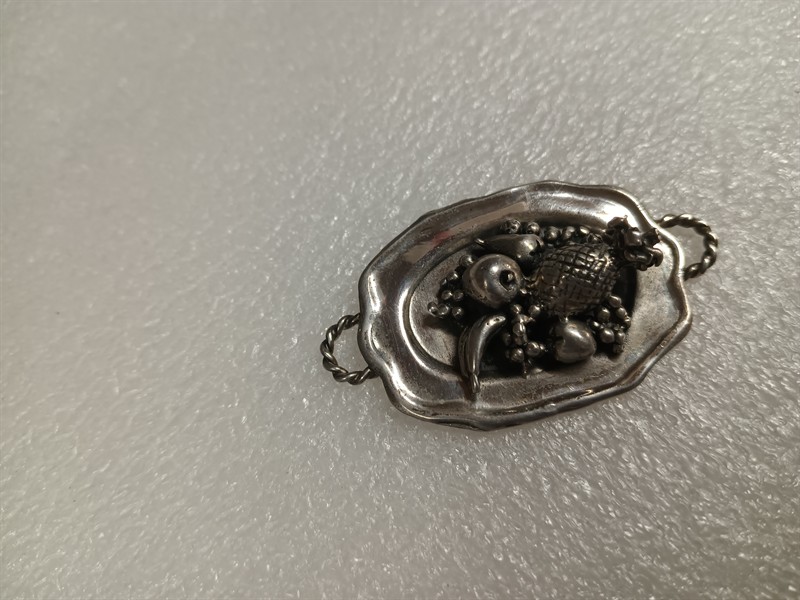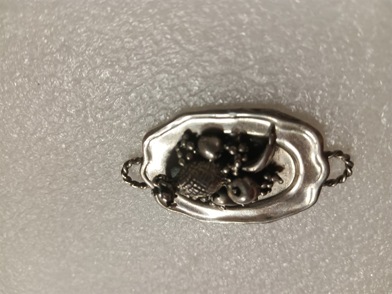 Miniatura - podnos s exotickým ovocem, materiál stříbro ryzosti 800/1000 . Délka 5,5 cm . Hmotnost 17,42 gr . Přiložena boleta Puncovního úřadu.