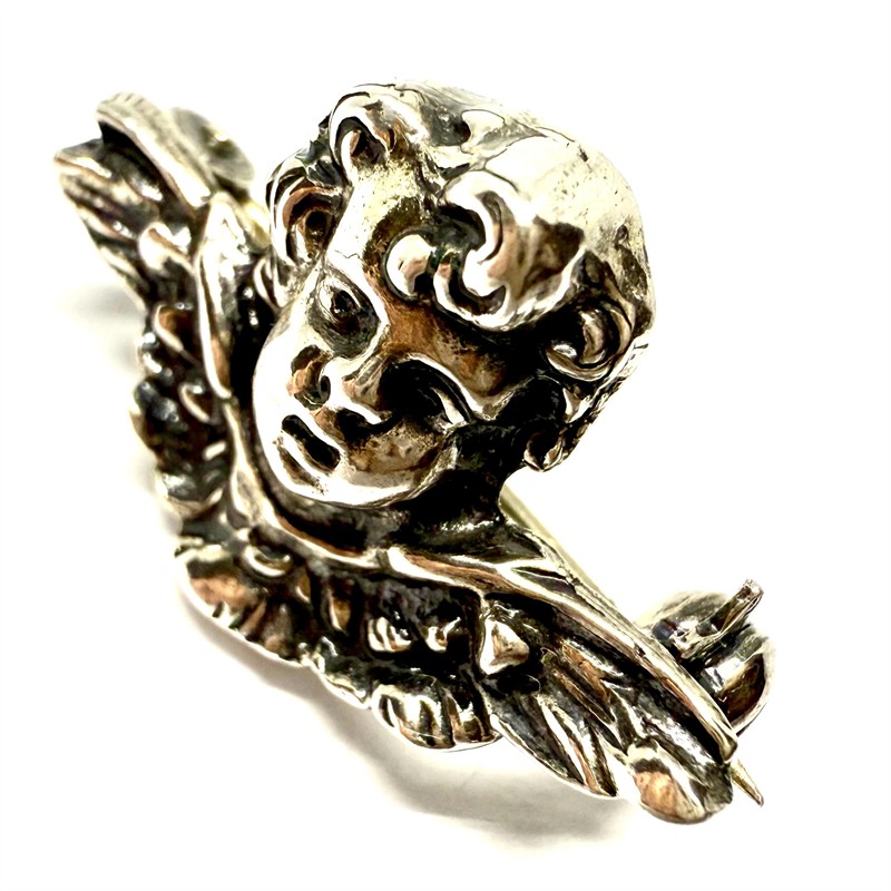 Miniaturní stříbrná brož - anděl. Šperk byl vyroben ze stříbra ryzosti 835/1000 o váze 4,10 g. Jehla obecný kov. Rozměry 2,4 x 1,4 cm. Výborný stav.