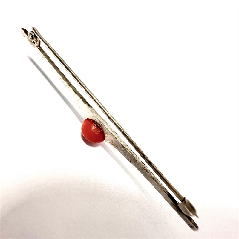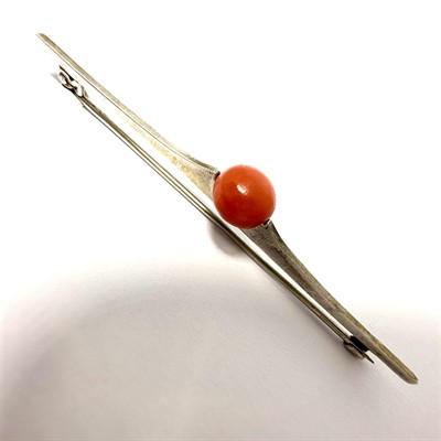 Nadčasová, minimalisticky pojatá stříbrná brož. Šperk byl zhotoven ze stříbra ryzosti 800/1000 v první polovině 20.století. Dominuje sytě lososově zbarvený korál o průměru 8mm. Stříbro ryzosti 800/1000, celková váha 3,52 g. Délka 7 cm. Perfektní stav.