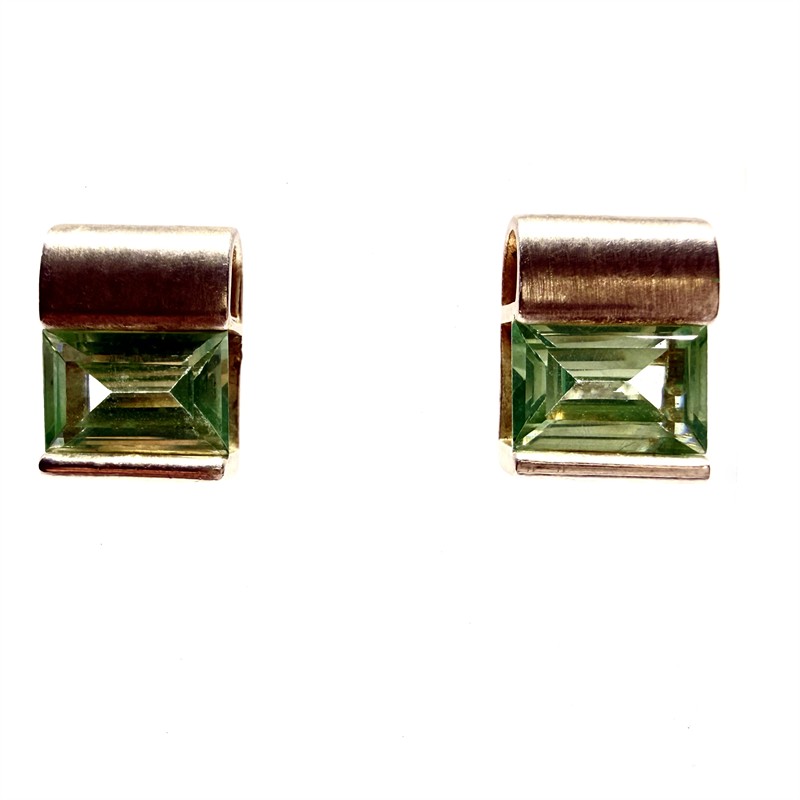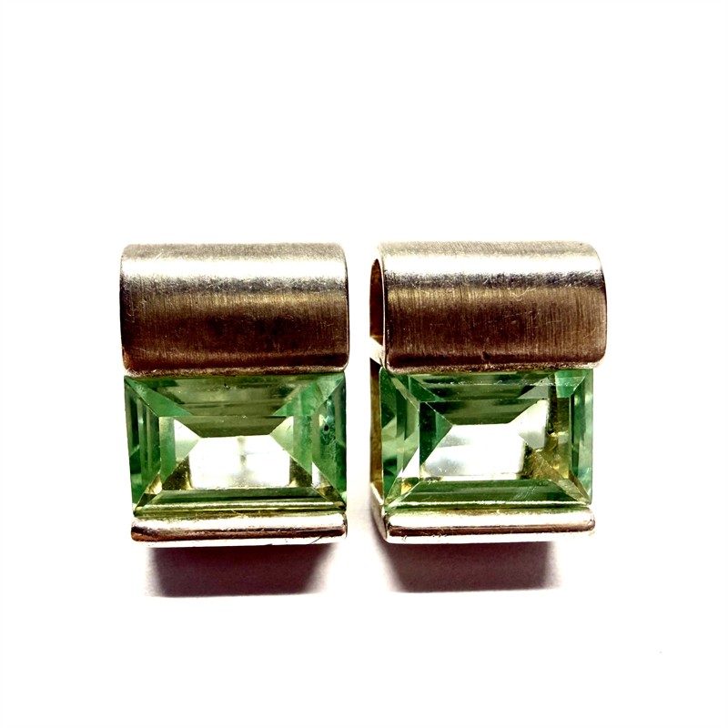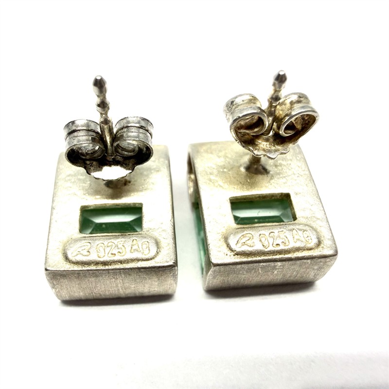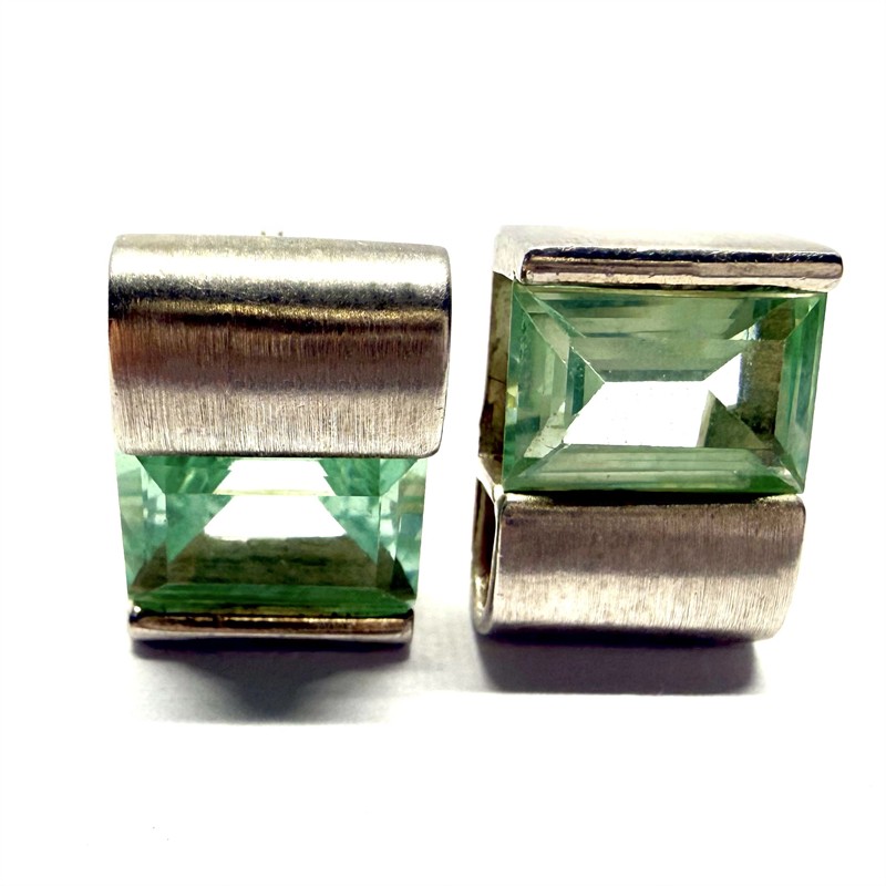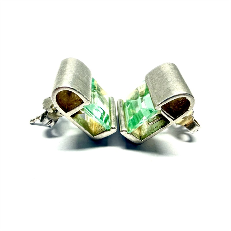 Originální, autorské náušnice. Zhotoveny ze sterlingového stříbra (925/1000) v minimalistickém, moderním stylu. Náušnicím dominuje modrozelený, jiskrný spinel fazetového brusu. Celková váha 7,64 g. Rozměry 1,4 x 1 cm. Perfektní stav.