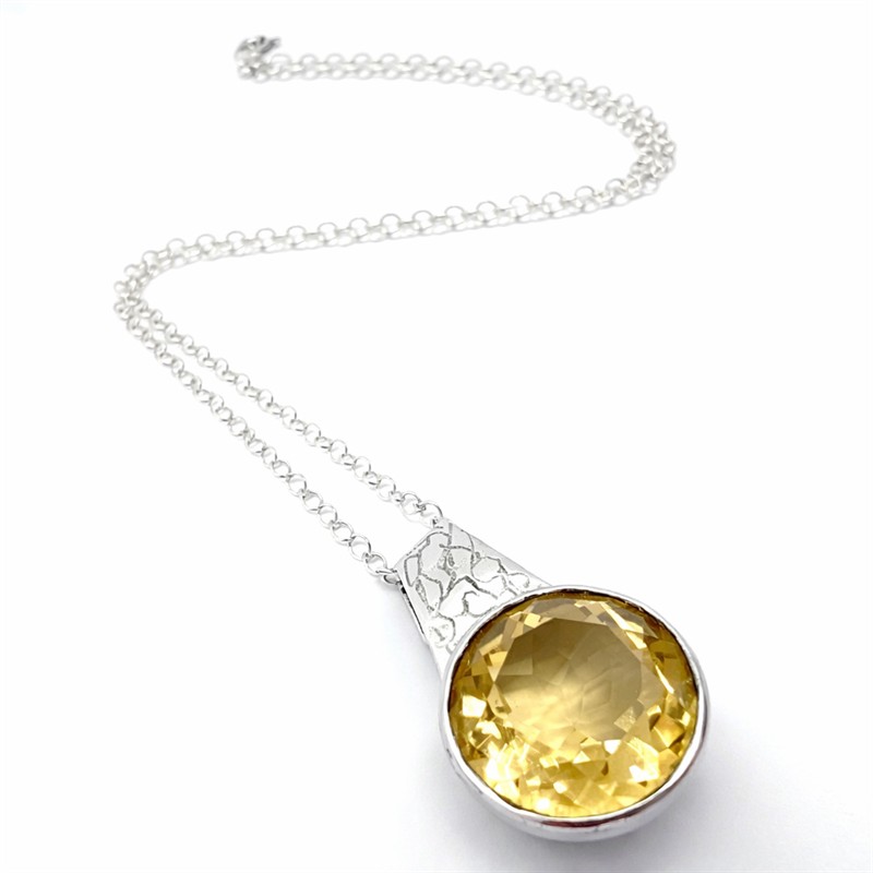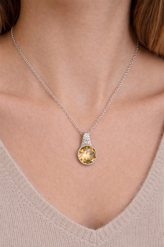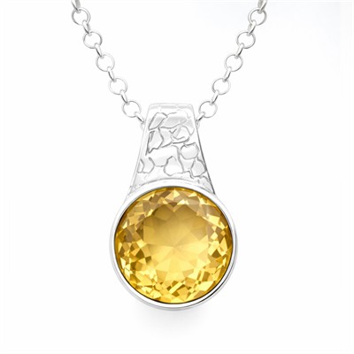 Originální, nadčasový stříbrný náhrdelník. Šperku dominuje rafinovaně broušený citrín střední barevné sytosti, kruhového tvaru. Šperk byl zhotoven ze stříbra sterlingové ryzosti (925/1000). Váha náhrdelníku 9,53 g. Délka řetízku 41 cm. Rozměry závěsu cca 2,5 x 1,5 cm. Perfektní stav.