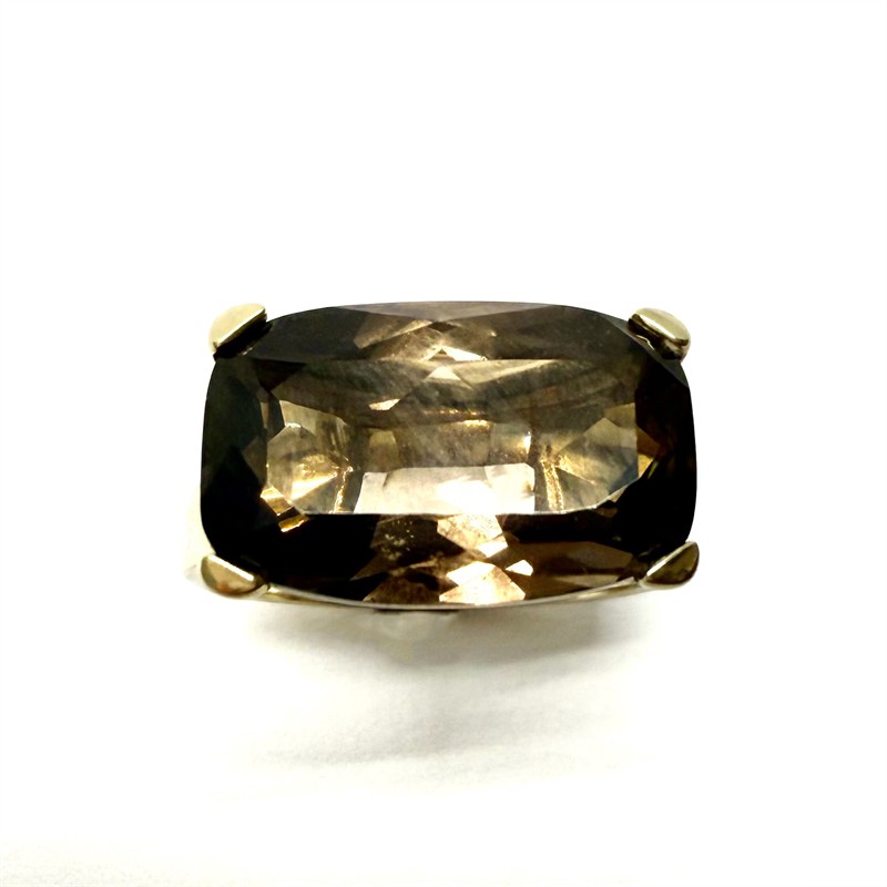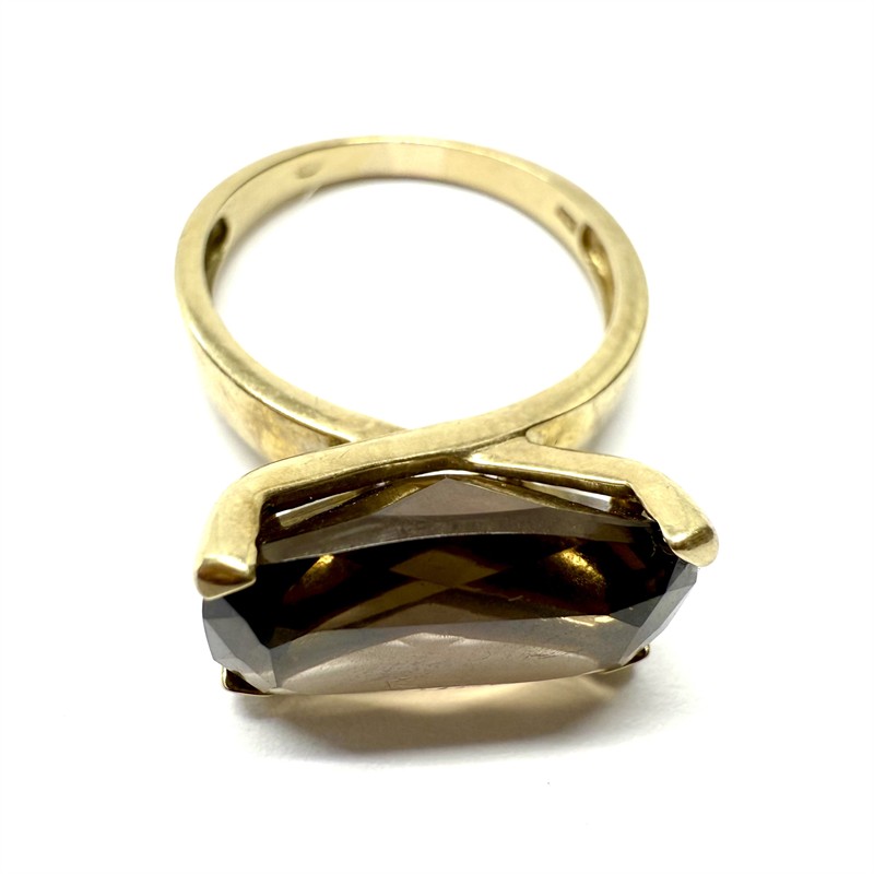 Nadčasový, minimalistický prsten. Šperk byl vyroben ze zlata ryzosti 333/1000, o celkové váze 4,23 g. Šperk zdobí větší, fazetově vybroušený kouřový topaz tmavě hnědého odstínu. Velikost 56. Profesionálně vyčištěno, perfektní stav.