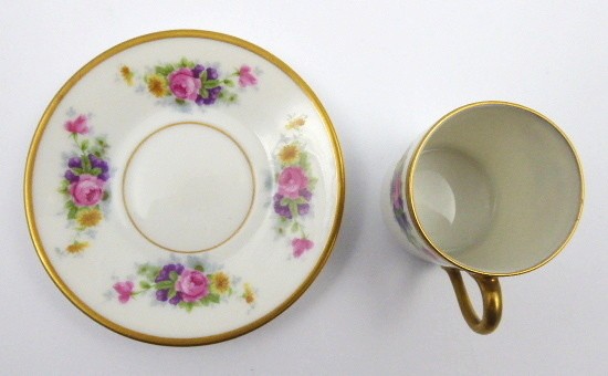 Bílý, barevný a zlacený porcelán. Porcelánka Rosenthal. Kávový šálek z bílého porcelánu dekorovaný barevnými kyticemi a zlacenými linkami. Značeno zespodu: firemní značka a značka malíře. Německo, Selb, 20. léta minulého století. Výška šálku 4,5 cm, průměr podšálku 10,5 cm.