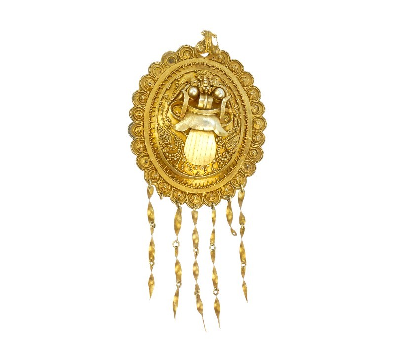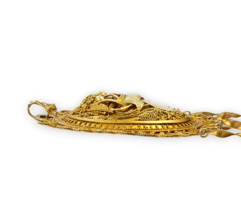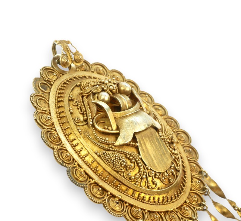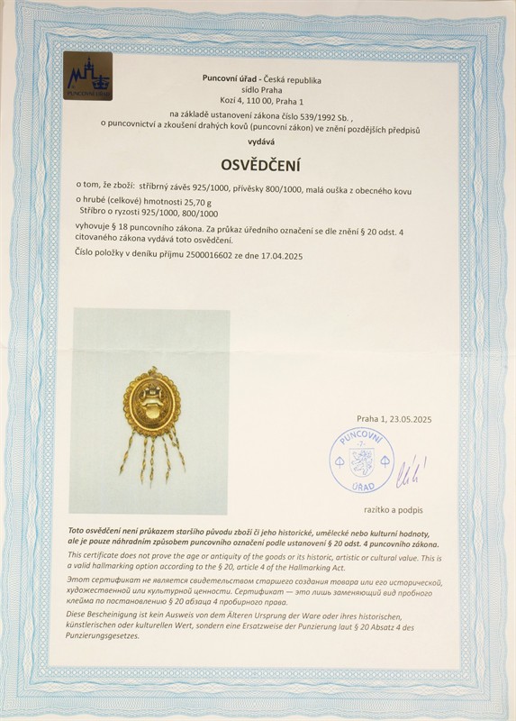 Velký rakousko-uherský závěs ze zlaceného stříbra ryzosti 925/1000, přívěsky 800/1000. Malá ouška z obecného kovu. Rozměry 11 x 5,5 cm. Celková hmotnost 25,70 g. Ke šperku vyhotoveno osvědčení Puncovního úřadu. Část ověsků chybí, když se odstraní jeden neúplný (kratší - viz foto), ověsky budou symetrické.