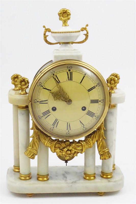 Bílý mramor, bronz, originální klíč součástí. Ve francouzském stylu. Mramorové stolní sloupkové hodiny ve francouzském stylu. Stroj s kotvovým krokem, půlové bití na zvonek. Šest světlých sloupků z mramoru s bronzovými patkami a hlavicemi. Světle žlutý kovový ciferník s černými římskými a arabskými číslicemi a mosaznou hodinovou ručičkou. Široká bronzová ozdoba ve tvaru závěsu (baldachýnu) s květinami. Mramorová váza, bronzové květy. Hodinový stroj značen: W278, EAH, P21. Originální klíč přiložen. Funkční. Vzhledem ke stáří hodinek bez záruky přesnosti chodu a dlouhodobé funkčnosti. Evropa, minulé století. Výška 42 cm, šířka 28 cm a hloubka 14 cm.