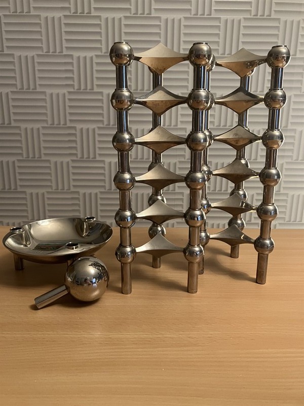 modulární svícen (cín/chrom) navržený architektem Wernerem Stoffem pro kovodělníka Hanse Nagela v Dánsku v 60.letech. Originál ze 60.let., 12ks svícnů + miska + sféra.