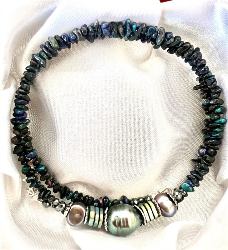 Výjimečný náhrdelník z pravých etiopských opálů vysoké kvality okouzlí svou jedinečnou hrou barev, ve které se prolínají odstíny zelené, modré i hlubších tmavých tónů. Každý opál je originál, a právě tato přirozená rozmanitost dodává šperku neopakovatelný charakter. Dominantním prvkem jsou tři výrazné šedozelené perly, které v kombinaci s jemnými stříbrnými detaily vytvářejí elegantní a harmonický celek. Kontrast mezi opály, perlami a stříbrem podtrhuje sofistikovaný a luxusní vzhled náhrdelníku. Náhrdelník je navlečen na pevném ocelovém lanku, které zajišťuje vysokou odolnost, bezpečnost a dlouhou životnost. Ukončení a veškeré viditelné komponenty jsou vyhotoveny ze stříbra, které dokonale ladí s celkovým designem šperku.