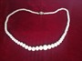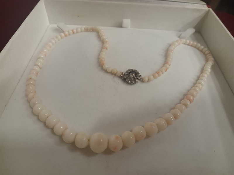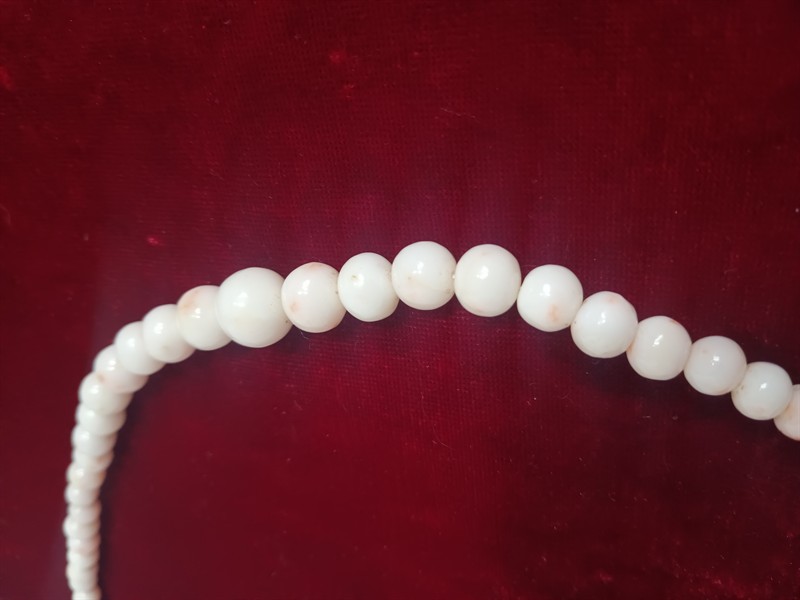 Náhrdelník z velmi světlých korálů sestupné velikosti ( centrální korál v průměru ca 1,3 cm ) . Zapínání z obecného kovu. Délka 55 cm .