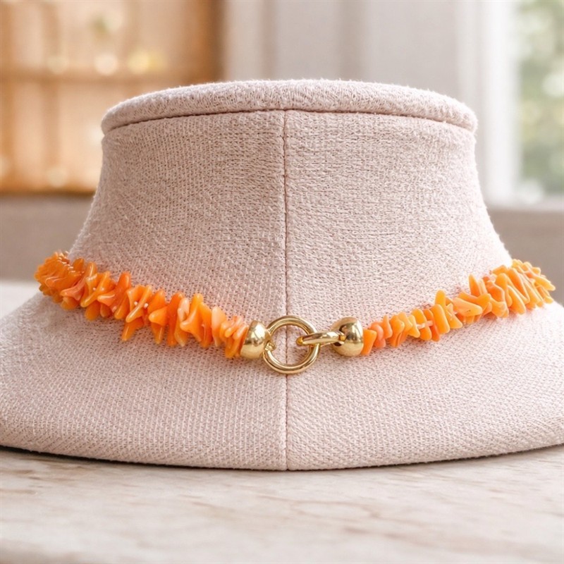 Výjimečný náhrdelník z pravého mořského korálu, který zaujme svojí neobyčejnou, málo vídanou barvou a elegantním vzhledem. Korály jsou navlečeny na hedvábí a pečlivě prokládány uzlíky – kvalitní šperkařská práce zajišťující dlouhou životnost i bezpečné nošení. Délka cca 52 cm, doplněno bezpečnostním zapínáním typu double, pozlaceným 18karátovým zlatem.