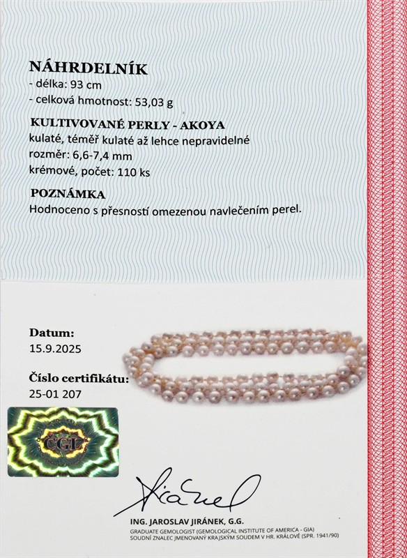 Materiál: perly Akoya Hmotnost: 53,03 g Rozměry: délka 93 cm, průměr 6,6-7,4 mm Drahokamy: - 110 ks kultivovaných perel Akoya, kulaté, téměř kulaté až lehce nepravidelné, průměr 6,6-7,4 mm Stav: výborný Doklady: Certifikát z gemologické laboratoře je součástí šperku Pro vaše maximální pohodlí nabízíme kompletní zlatnický servis: úpravy velikosti, odborné opravy, rhodiování, výměny kamenů, profesionální čištění, leštění i znalecké odhady. Vše přizpůsobíme vašim přáním.