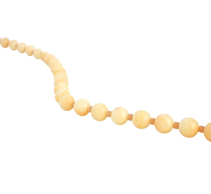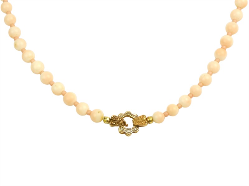 Náhrdelník je vyroben z přírodního růžového korálu známého jako "andělská kůže" (Angel Skin Coral). Tento typ korálu je typický svou jemnou, bledě růžovou až krémovou barvou a je opatřen se zdobným uzávěrem ze zlata ryzosti 585/1000. Délka 80 cm. Pečlivě prouzlíkovaný.