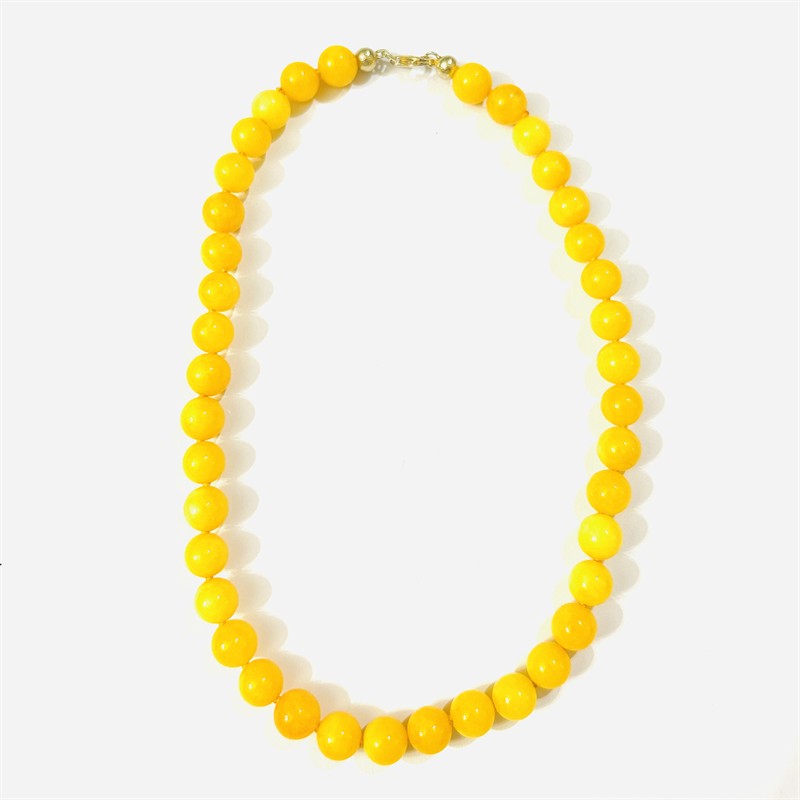Výrazný náhrdelník ze šňůry kulatých korálů přírodního žlutého avanturínu, koncové kuličky s korespondujícím organickým povrchem. Kvalitní tuzemská práce z počátku 20. let 21. století. Zapínání a koncové kuličky zhotoveny z jemně zlaceného stříbra o ryzosti 925/1000; ryzostní číslo na zapínání. Hmotnost 57,52 g, délka 43 cm, průměr korálů 10 mm. Nově navlečeno na žlutou niť, korále jsou mezi sebou pečlivě uzlíkovány. Karabinkové zapínání v pořádku, celkově ve velmi zachovalém stavu.