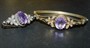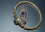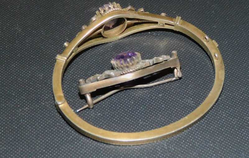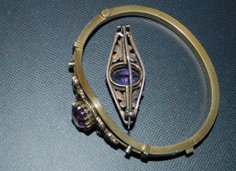Náramek a brož - stříbro, puncovní značky Rak.-Uhersko, zač. 20. stol., velikost brož 4 x1,5 cm, váha 8,0 gramu. Náramek zevní rozměr 6,6 x 6 cm, vnitřní 5,8 x 5 cm, váha 15,3 gramu. Stav velmi dobrý, jen u náramku chybí po stranách dvě perličky, jinak potřebují odborně vyčistit. Osazení dvěma velkými ametysty a 34 malými perličkami.
