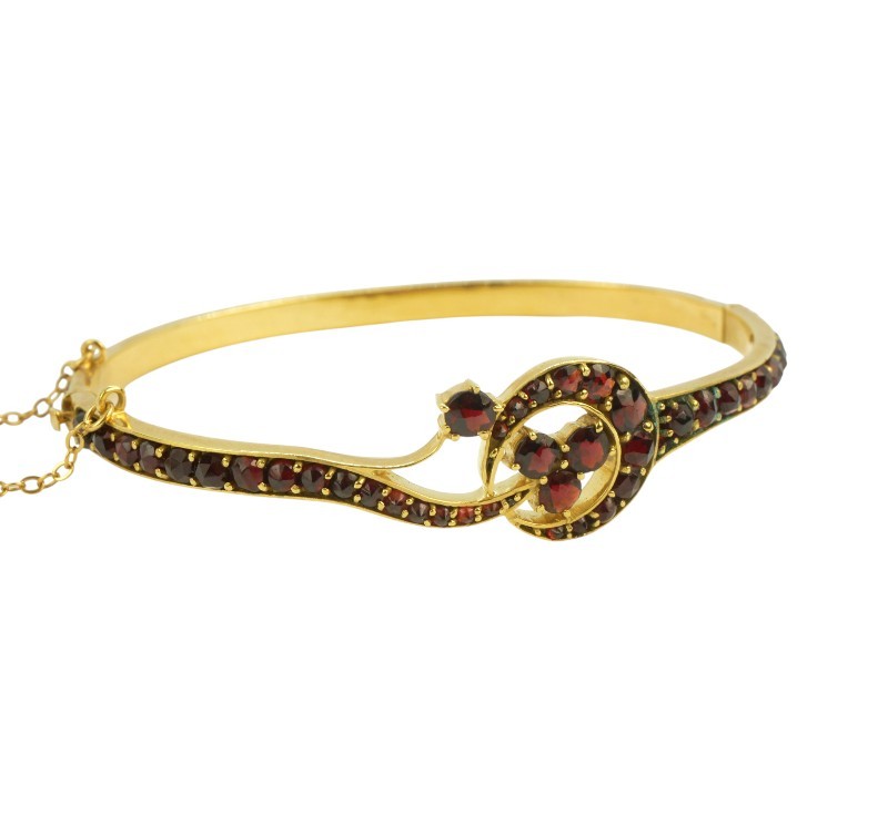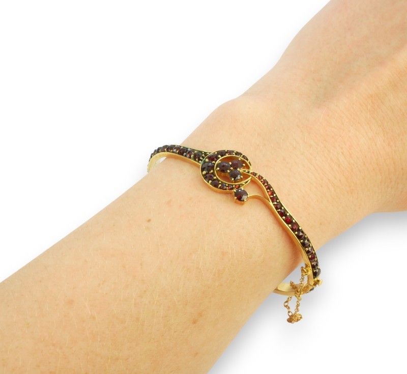 Náramek s pravými českými granáty je kruhový, otevírací. Je opatřený pojistným řetízkem. Materiálem je tombak, speciální kov, do kterého se zasazovaly české granáty v 19. století. Celý náramek je pozlacený 14 kt zlatem. V náramku je zasazeno 62 pravých českých granátů o průměru 1 až 3 mm a 8 českých granátů v centrální ozdobné části náramku o průměru 4 mm. Žádný granát nechybí, náramek je v krásném stavu, málo nošený. Průměr náramku je 6 cm a obvod náramku je 19 cm.