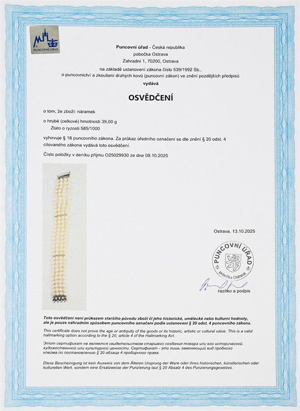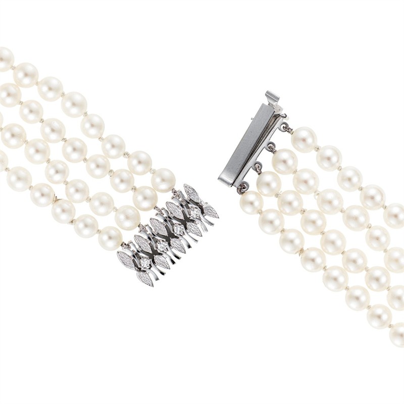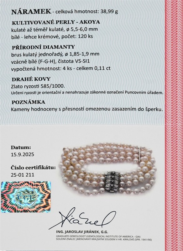 Materiál: bílé zlato o ryzosti 585/1000 Hmotnost: 39,00 g Rozměry: délka 21 cm, šířka 2,5 cm Drahokamy: 120 ks kultivovaných perel Akoya, bílá lehce krémová, průměr 5,5-6,0 mm 4 ks přírodních diamantů, 0,11 ct celkem, vzácně bílý (F-G-H), čistota VS - SI1, Stav: výborný Doklady: Osvědčení Puncovního úřadu České republiky Certifikát z gemologické laboratoře je součástí šperku Pro vaše maximální pohodlí nabízíme kompletní zlatnický servis: úpravy velikosti, odborné opravy, rhodiování, výměny kamenů, profesionální čištění, leštění i znalecké odhady. Vše přizpůsobíme vašim přáním.