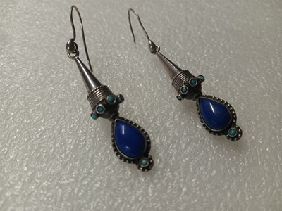 Dlouhé visací náušnice vyrobené ze stříbra ryzosti 925/1000, s tyrkysy a lapis lasuli. Hrubá hmotnost 9,38 gr. Délka 63 cm . Přiložena boleta Puncovního úřadu.