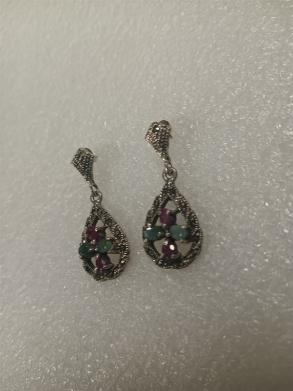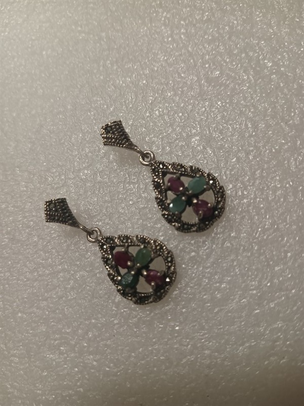 Náušnice stříbro ryzosti 750/1000, zdobené smaragdy, rubíny a markazity . Pokoveny vrstvou niklu . Délka 3,5 cm . Hrubá hmotnost 6,99 gr.