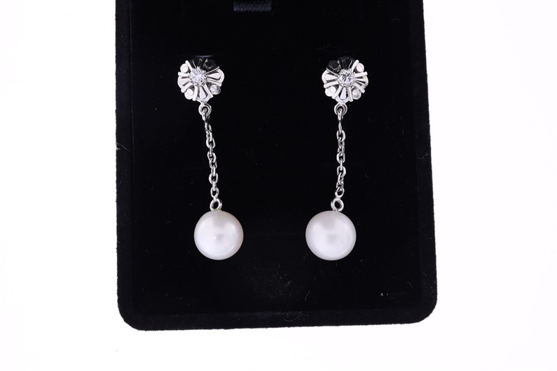 gantní náušnice z bílého zlata Au 585 (puncované), zdobené jemnými brilianty o průměru cca 2,75 mm (celková hmotnost briliantů přibližně 0,16 ct). Z náušnic na jemném řetízku visí kulaté perly o průměru 9 mm, které dodávají šperku klasický a ženský vzhled. Materiál: bílé zlato Au 585 Kameny: brilianty celkem cca 0,16 ct Průměr briliantu: cca 2,75 mm Průměr perly: 9 mm Délka náušnic: 35 mm Průměr horní části: 8,2 mm Celková hmotnost: 5,39 g