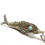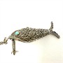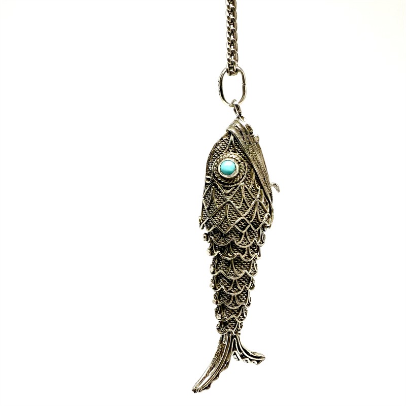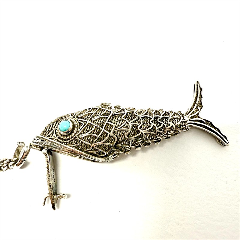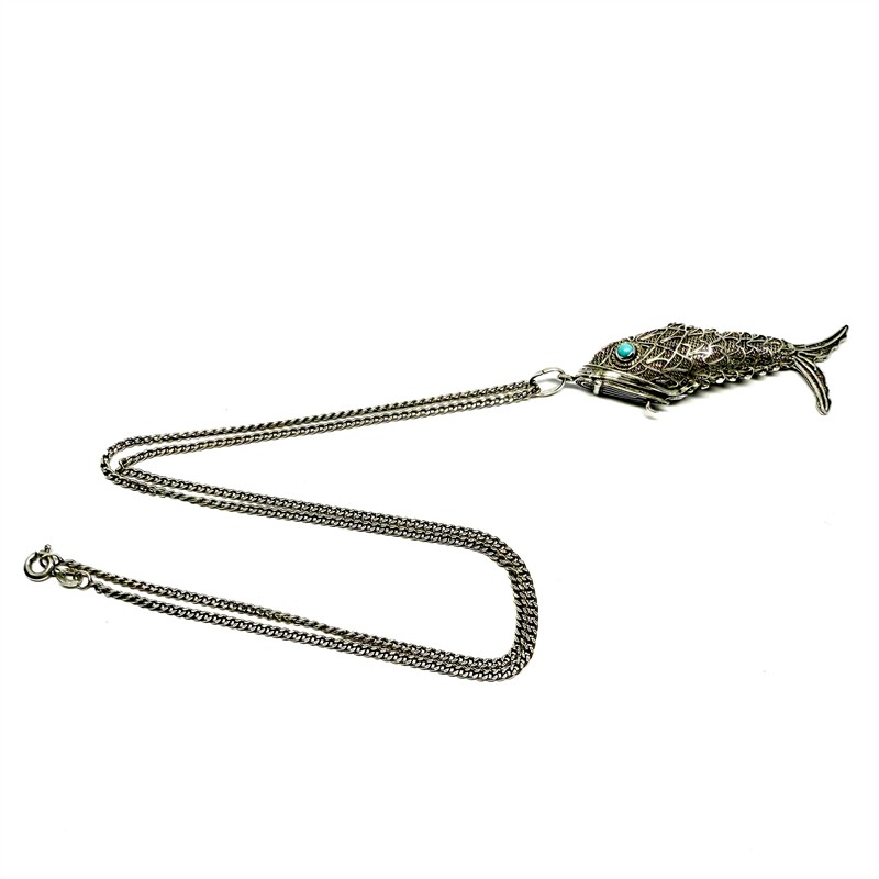 Stříbrný náhrdelník s nevšedním závěsem - detailně propracovanou rybou. Šperk byl zhotoven ze stříbra ryzosti 835/1000 koncem první poloviny 20.století. Ryba je otvíratelná, uvnitř skýtá místo na vatu s vonnými esencemi. Oko zdobí tyrkys. Tělo ohebné, složené z článků. Řetízek stříbro ryzosti 925/1000. Celková váha šperku 14,36 g. Délka řetízku 55 cm. Perfektní stav.