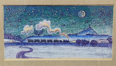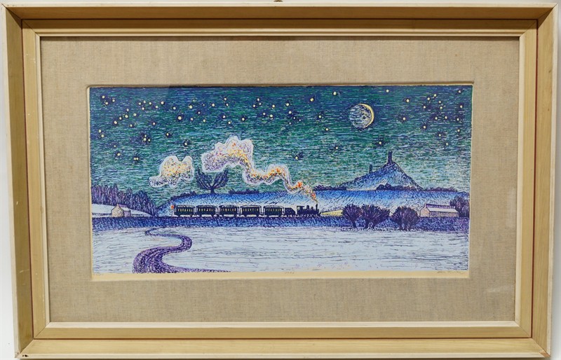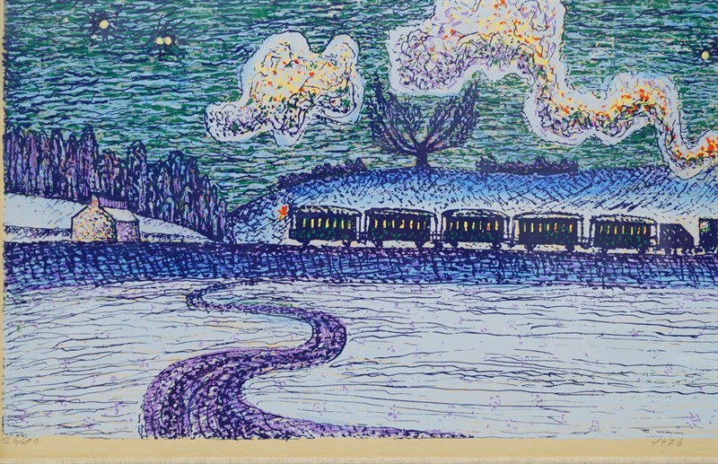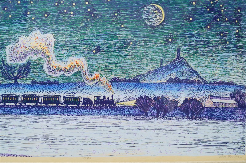 Noční vláček pod Hazmburkem Dan RICHTER litografie 1976