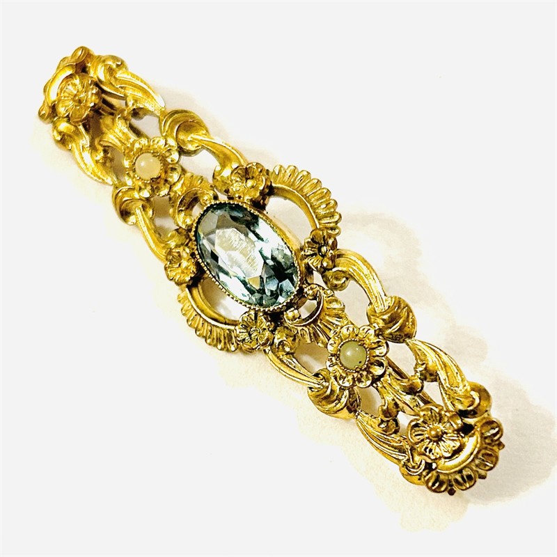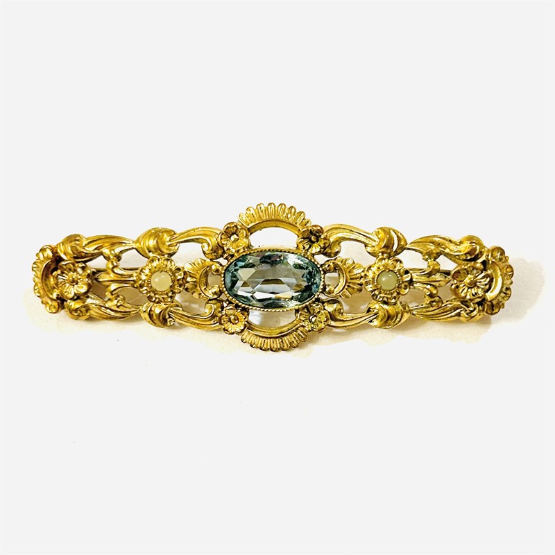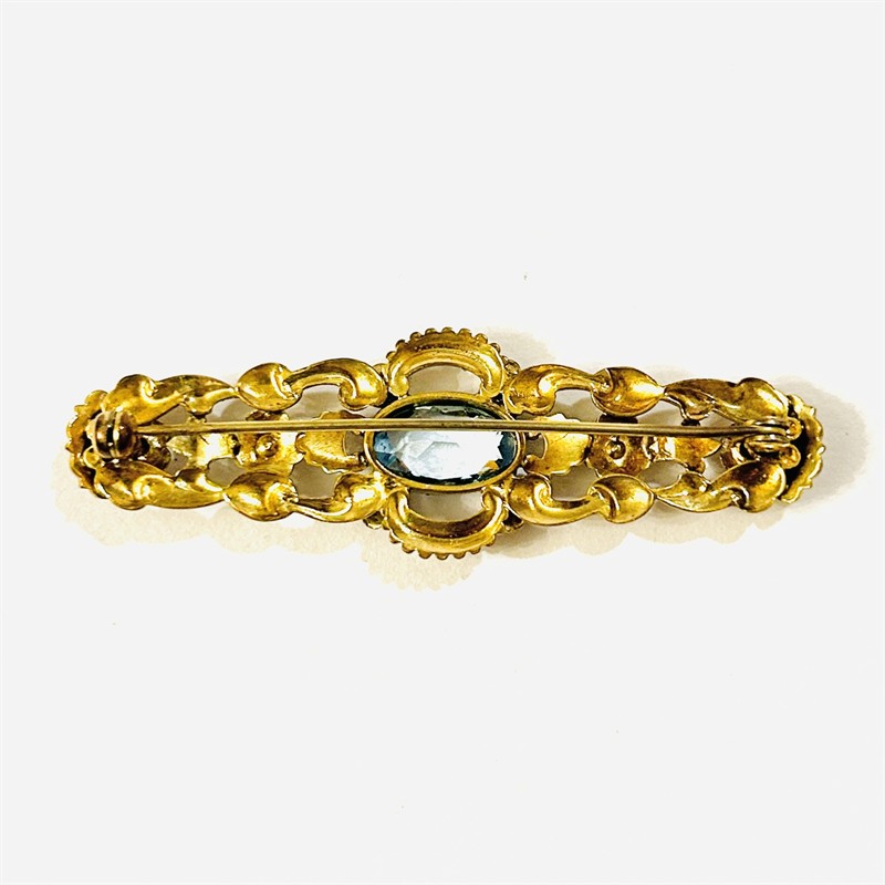 Dekorativní, honosná brož osazena přírodním modrým topazem oválného brusu, doplněno 2 skleněnými perličkami. Novobarokně pojaté tělo s ladnými florálními motivy a rokaji. Solidní západoevropská zlatnická práce z počátku 20. století. Zhotoveno ze zlaceného obecného kovu; neznačeno. Hmotnost 6,69 g, délka 60 mm, šířka 19 mm. Zapínání včetně pojistky v pořádku, nečištěno, v dobrém stavu.