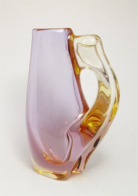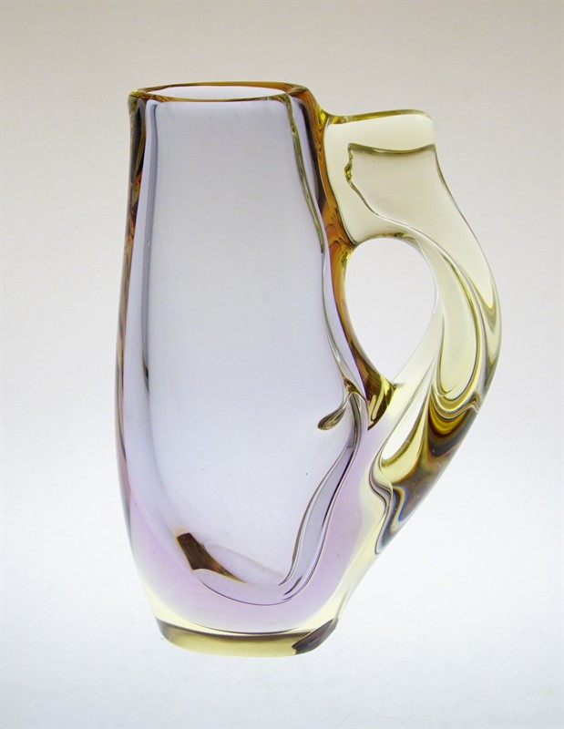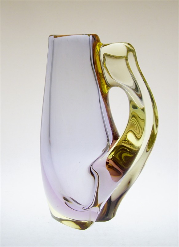 Málo vídané provedení velmi masivní vázy s uchem - objekt z hutního skla s jádrem v odstínu Alexandrit (Neodymové sklo mění barvu podle spektra osvětlení, viz foto) je přejímané sklem v odstínu Citrín. Autorem návrhu je sklářský výtvarník a pedagog Miloslav KLINGER (*1922 +1999). Provedly sklárny Železnobrodské sklo po roce 1970. Dobrý stav, rozměr - v. 24 x 15 x 8cm, hmot. 2,4kg