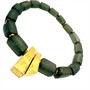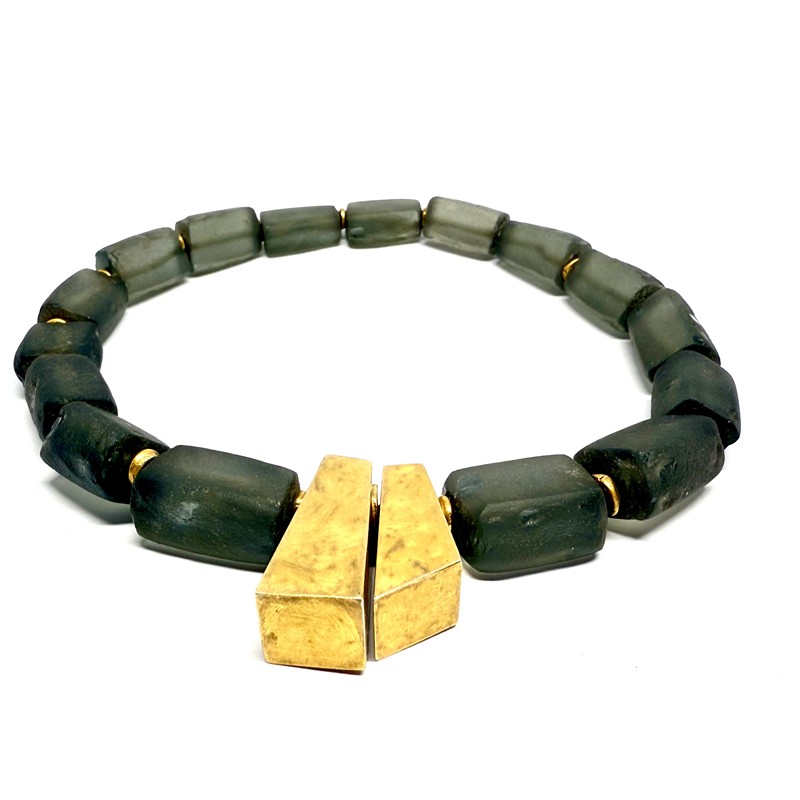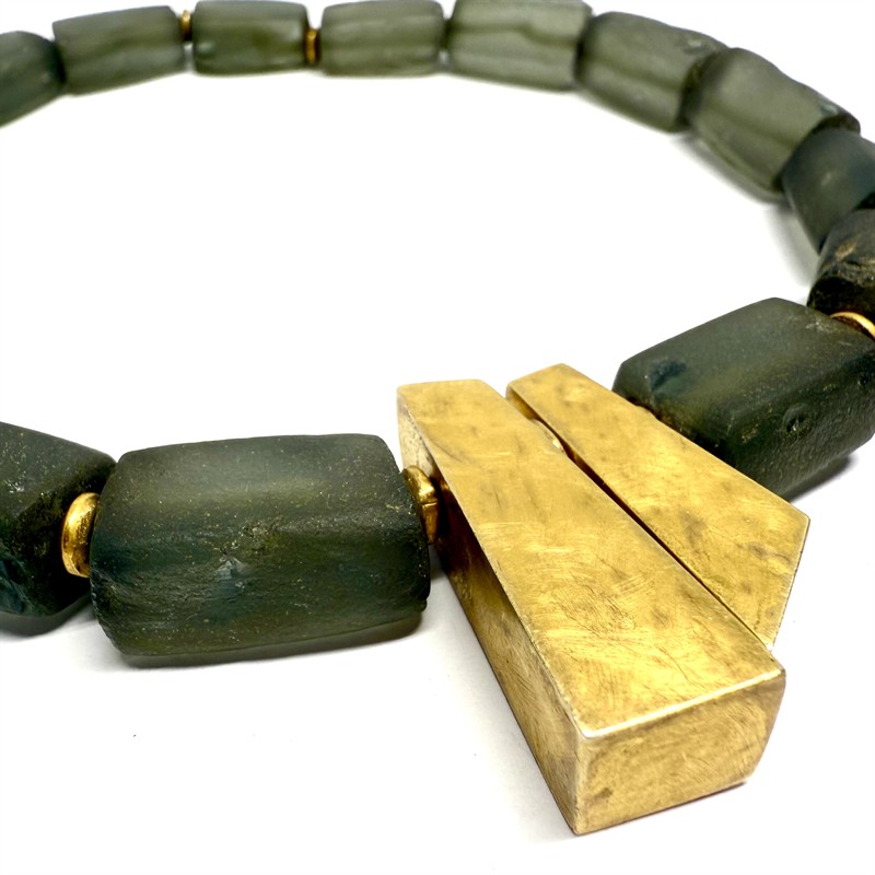 Originální, autorský náhrdelník z mořského skla lahvově zelené barvy. Šperku dominuje nevšední, rafinované, výrazné zapínání ze zlaceného stříbra. Povrch zdoben výrazným matováním. Stříbro ryzosti 925/1000, celková váha 195,76 g. Délka 47 cm. Výborný stav.