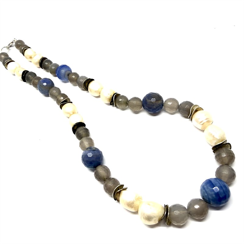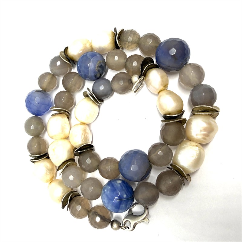 Originální náhrdelník z perel a drahých kamenů. Jedná se o chalcedony šedého a ocelově modrého odstínu, kontrastně dozdobeny perlami. Délka 50 cm. Náhrdelník se stříbrným zapínáním. Velmi dobrý stav.