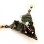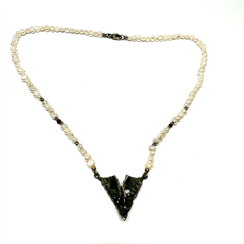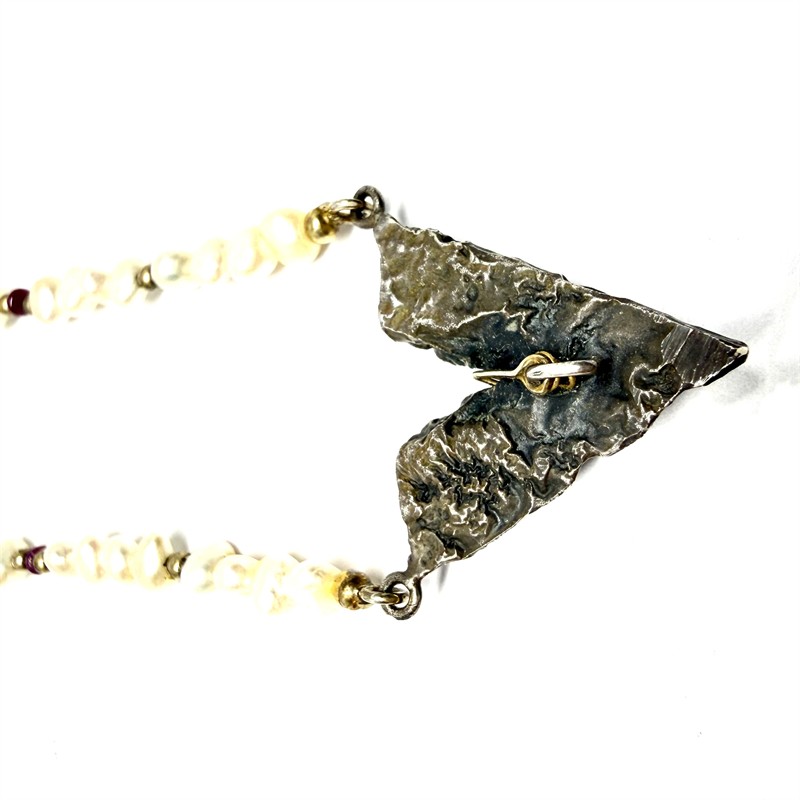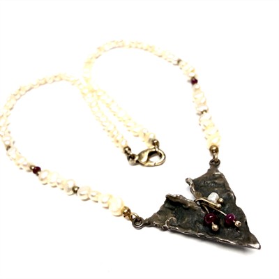 Velmi půvabný, originální náhrdelník z říčních perel. Šperk zdobí abstraktní stříbrná dekorace s drobnými rubíny a bílou perlou. Náhrdelník je ukončen zapínáním z pozlaceného stříbra. Stříbrné části zhotoveny ze stříbra sterlingové ryzosti (925/1000). Celková váha 10,61 g. Délka 40,5 cm.