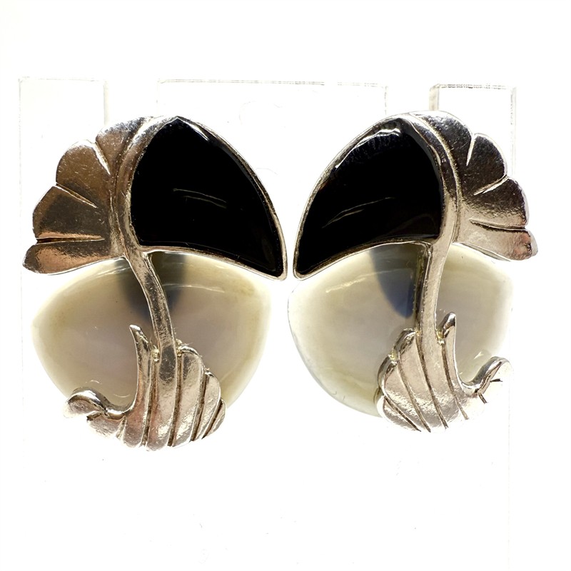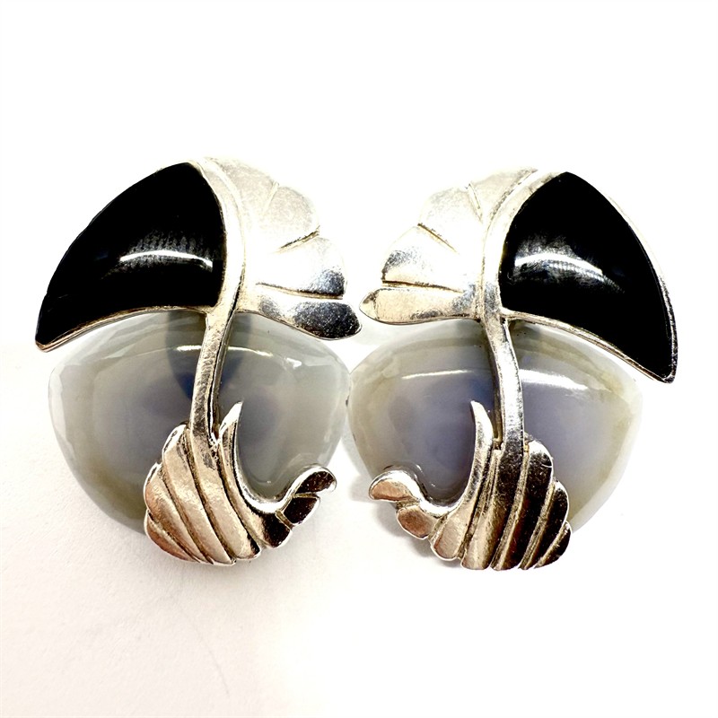 Výrazné, větší náušnice se zapínáním na puzetu. Zdobeno chalcedonem a černým onyxem. Stříbro ryzosti 925/1000. Celková váha 10,50 g. Rozměry cca 2,5 x 2 cm. Originální náušnice nesoucí přírodní motiv v perfektním stavu.