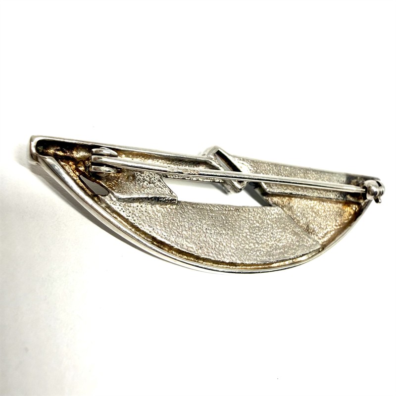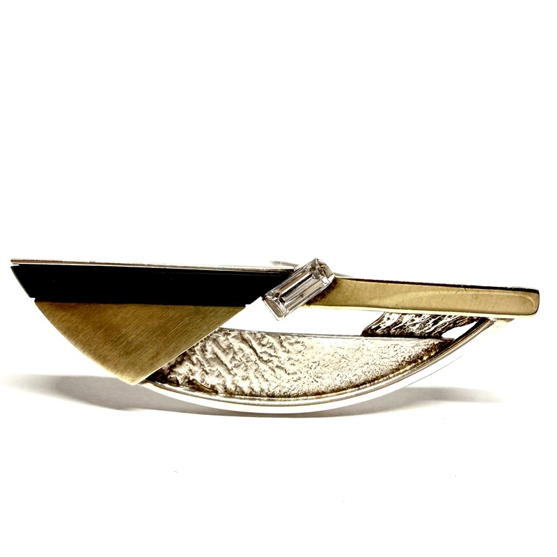 Originální,stříbrná brož zdobená onyxovým proužkem a kubickou zirkonii. Půvabná symbioza různých povrchů-matných,lesklých,strukturovitých s hladkými. Šperk byl zhotoven ze sterlingového stříbra (925/1000),o váze 6,74 g. Rozměry 5 x 1,5 cm. Značeno autorskou,puncovní a ryzostní značkou. Perfektní stav.