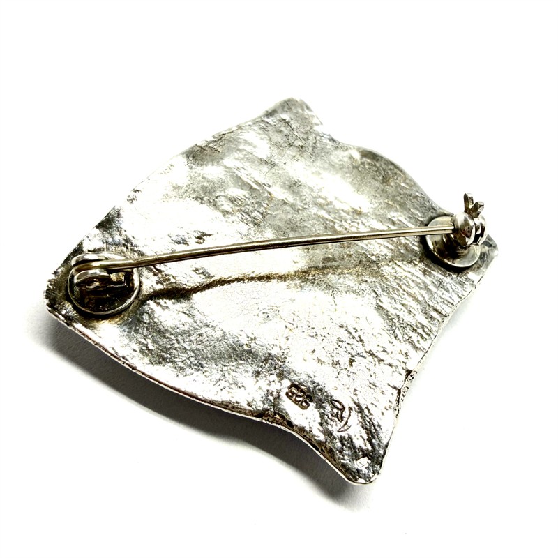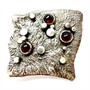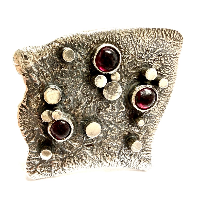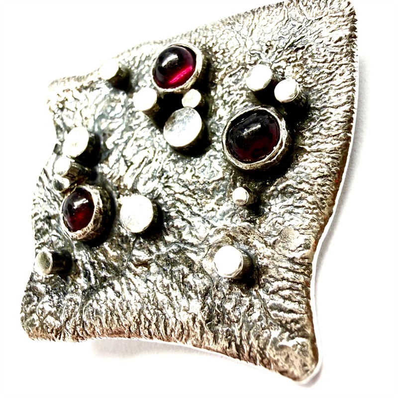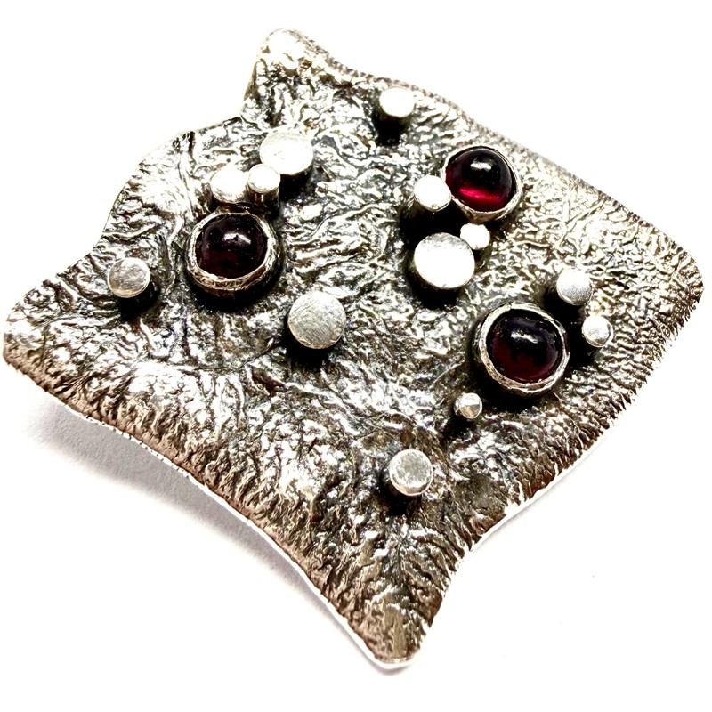Originální, autorská, abstraktní stříbrná brož. Šperk byl zhotoven z masivního stříbra sterlingové ryzosti (925/1000). Váha 19,81 g. Jehla obecný kov. Povrch šperku zdoben výraznou strukturou a plastickými stříbrnými aplikacemi. Šperk je osazen třemi tmavými almandiny, hladkého brusu kabašon. Rozměry cca 3,5 x 3,5 cm. Perfektní stav.