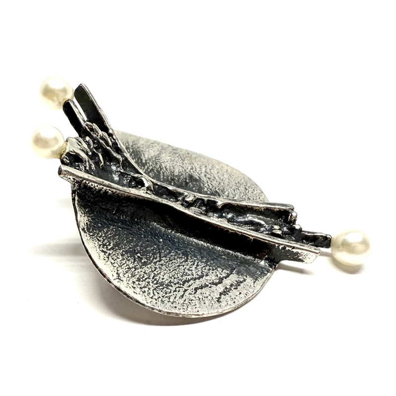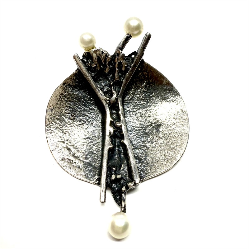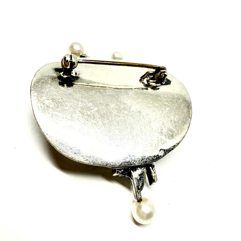 Originální, abstraktní stříbrná brož zdobená třemi sněhobílými perlami. Stříbro ryzosti 925/1000, jehla obecný kov. Celková váha 14,86 g. Rozměry cca 4,5 x 3,5 cm. Výborný stav.