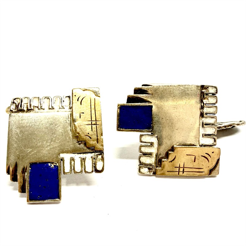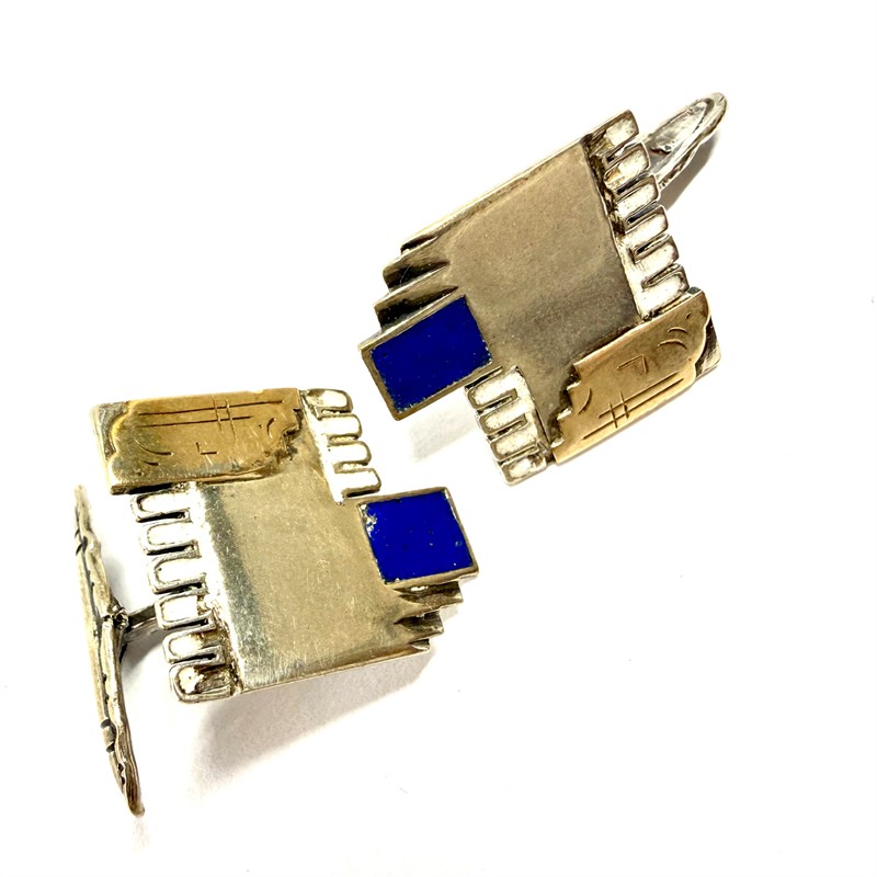 Originální, stříbrné manžetové knoflíky. Zhotoveny v nadčasovém duchu v první polovině 20.století. Zdobeno lápisem lazuli, zlacením a bílými smalty. Stříbro ryzosti 800/1000, celková váha 10,13 g. Velmi dobrý stav.