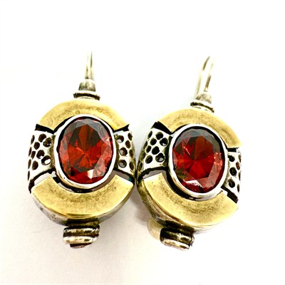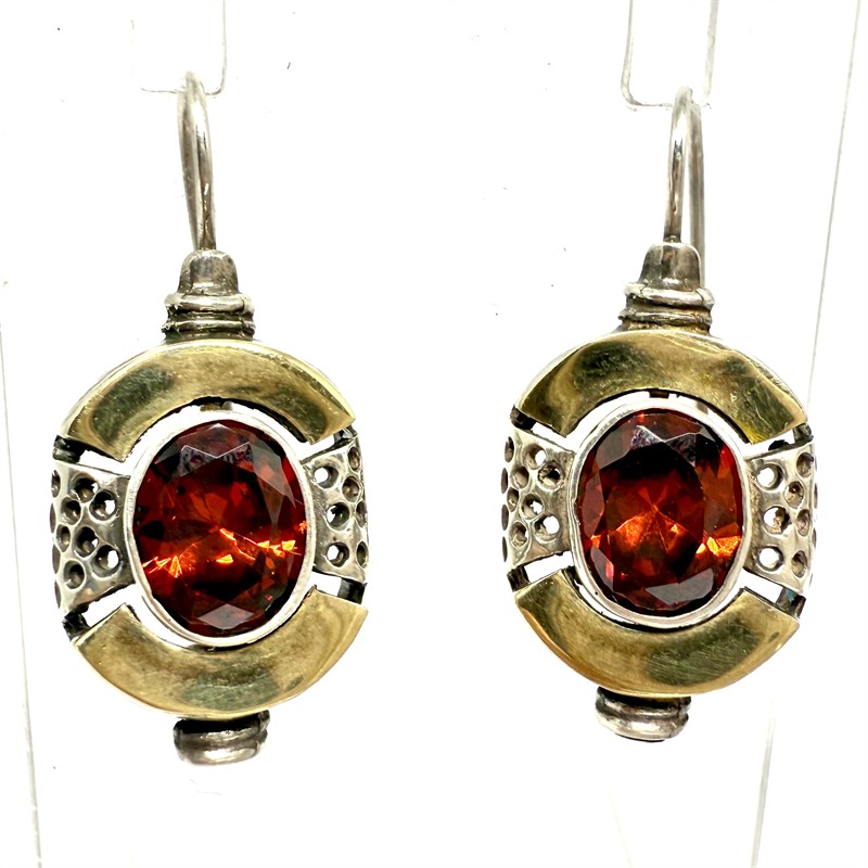 Originální, závěsné náušnice. Zhotoveny ze sterlingového stříbra (925/1000),o celkové váze . Náušnicím dominuje kubická zirkonie ve výrazném koňakovém odstínu. Nevšední, krásnou barvu kamene podtrhují pláty z nízkoryzostního zlata. Hmotnost 10,73 g. Ke šperku je zhotoveno Osvědčení Puncovního úřadu. Délka 3,2 cm. Perfektní stav.