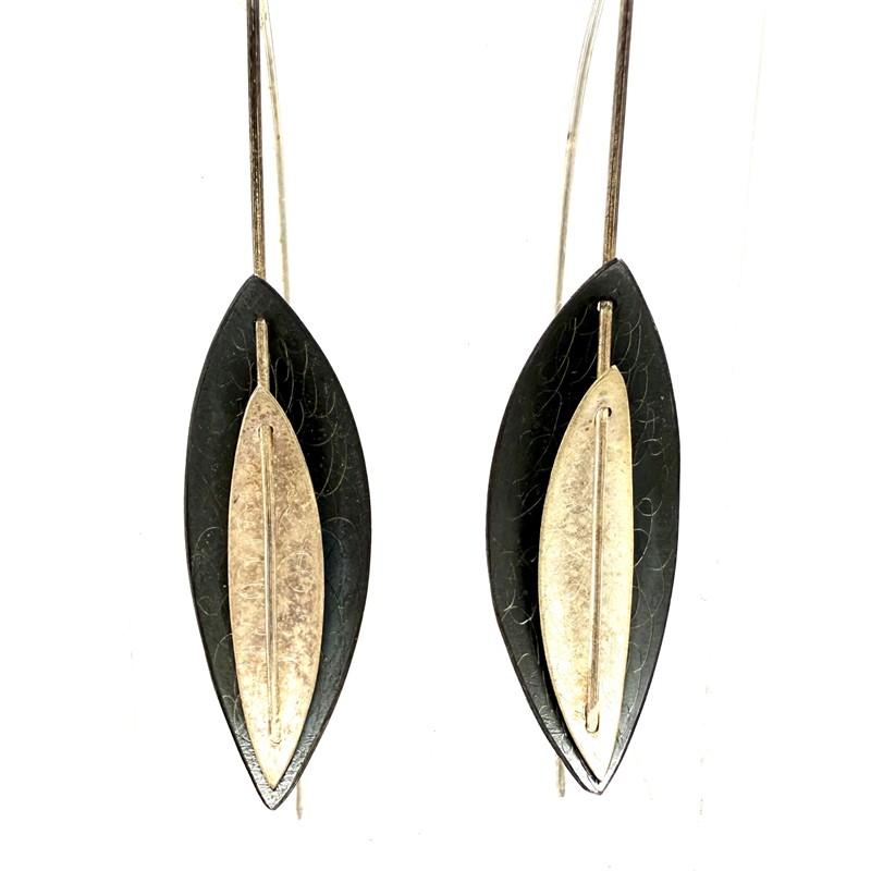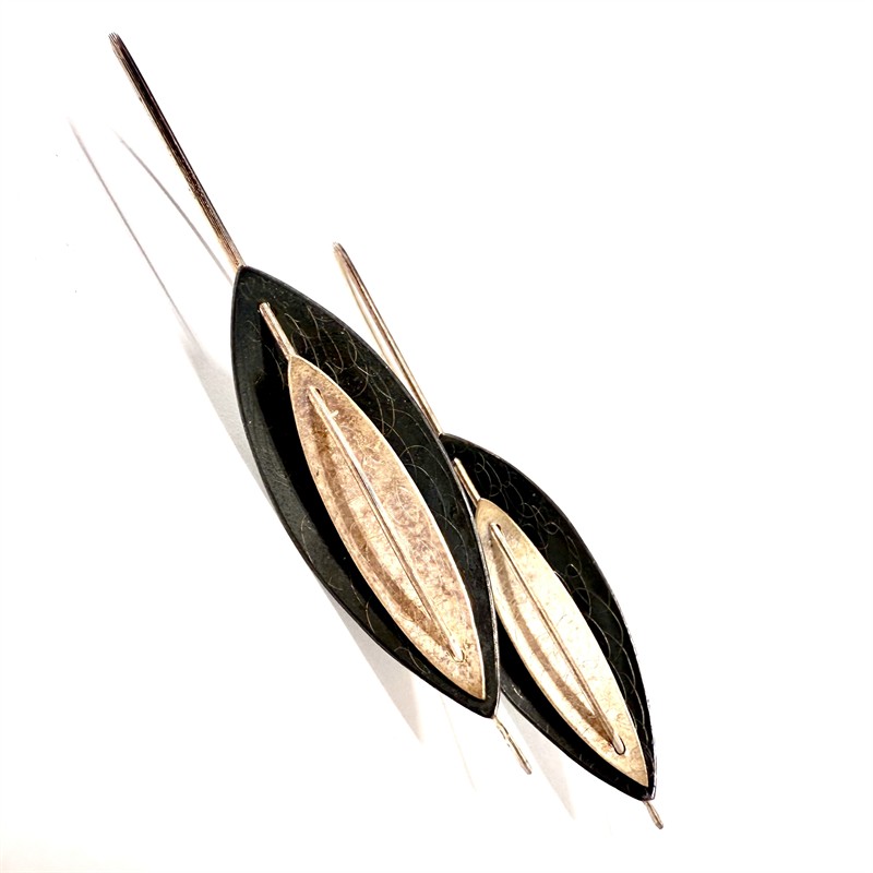 Originální, půvabné, něžné náušnice - listy. Sterlingové stříbro (925/1000). Celková váha 5,58 g. Náušnice jsou zajímavé nevšedním kontrastem ztmaveného a světlého povrchu. Jemným matem strukturovaný povrch zdobí jemné, abstraktní vlny. Délka 5,5 cm. Ateliérový, velmi příjemně nositelný šperk ve výborném stavu.