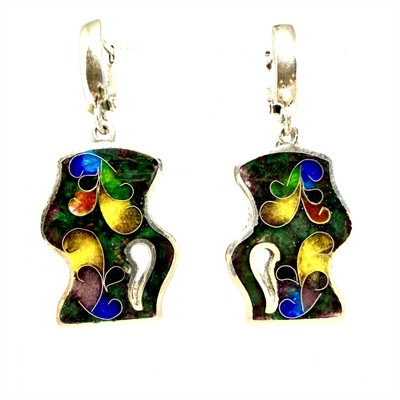 Originální, závěsné náušnice ze stříbra zdobené kinetickými ověsy s barevnými smalty. Náušnice byly zhotoveny ze stříbra sterlingové ryzosti (925/1000), o celkové váze 8,42 g. Délka cca 4 cm. Výborný stav.